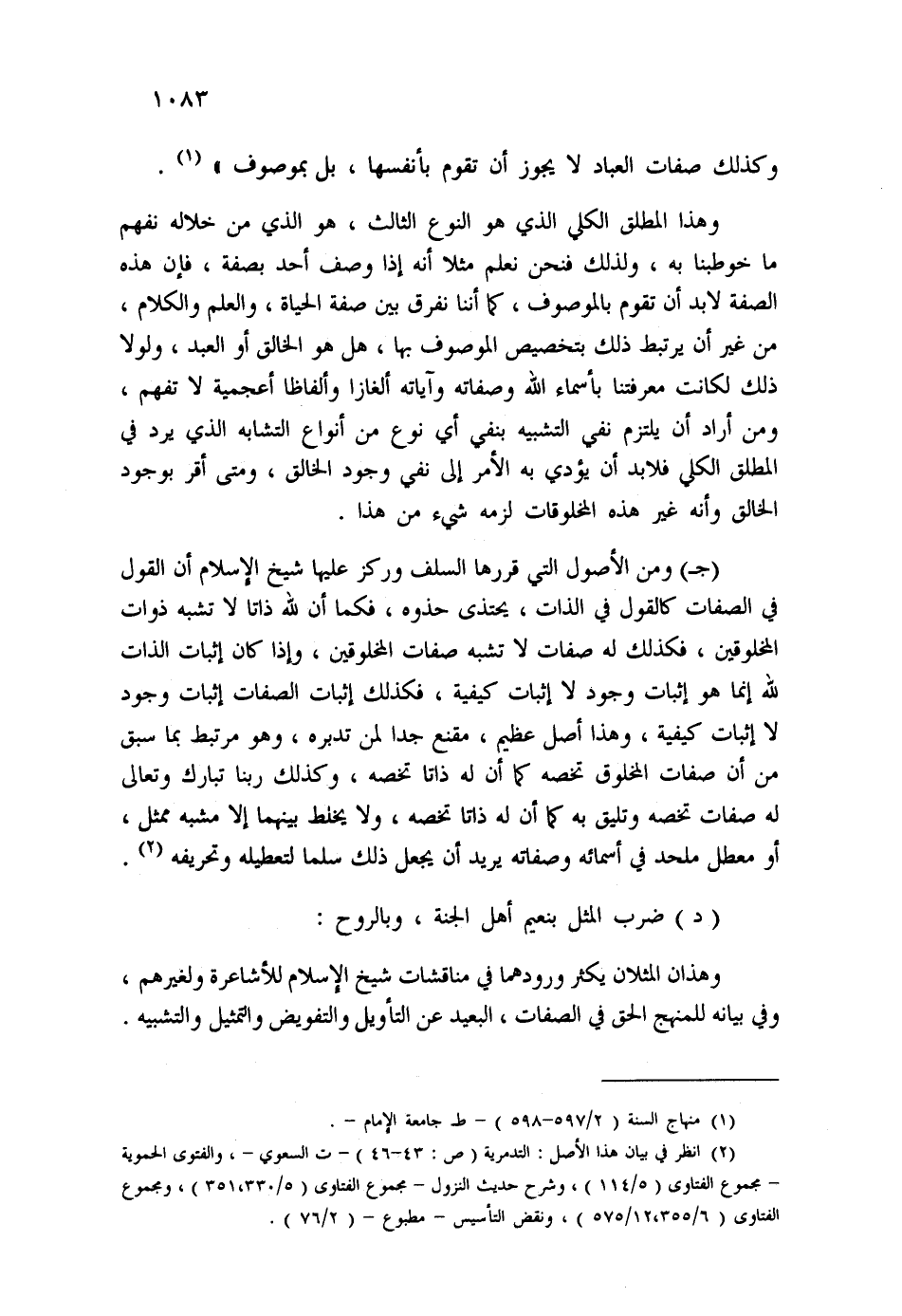 (¬2) انظر في بيان هذا الأصل: التدمرية (ص:43-46) - ت - السعودي -، والفتوى الحموية - مجموع الفتاوى (5/114) ، وشرح حديث النزول - مجموع الفتاوى (5/330، 351) ، ومجموع الفتاوى (6/355، 12/575) ، ونقض التأسيس - مطبوع - (2/76) .