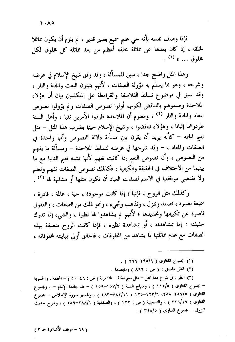 (¬3) انظر في شرح هذا المثل - مثل نعيم الجنة - التدمرية (ص: 46-50) - المحققة، والحموية - مجموع الفتاوى (5/115) ، ومنهاج السنة (2/157-159) - ط جامعة الإمام -، ومجموع الفتاوى (5/257-258، 6/123-125، 11/482-483) ، وتفسير سورة الإخلاص - مجموع الفتاوى (17/326) ، والتسعينية (ص: 122) ، والصفدية (1/288-289) ، وشرح حديث النزول - مجموع الفتاوى (5/348) .