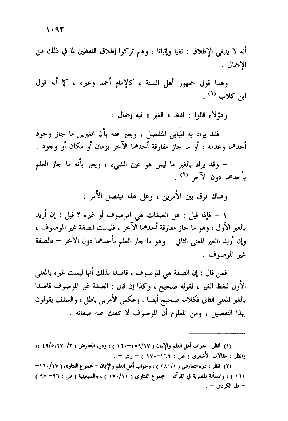 فمن قال: إن الصفة هي الموصوف، قاصد بذلك أنها ليست غيره بالمعنى الأول للفظ الغير، فقوله صحيح، وكذا إن قال: الصفة غير الموصوف قاصداً بالغير المعنى الثاني فكلامه صحيح أيضاً. وعكس الأمرين باطل، والسلف يقولون بهذا التفصيل، ومن المعلوم أن الموصوف لا تنفك عنه صفاته.