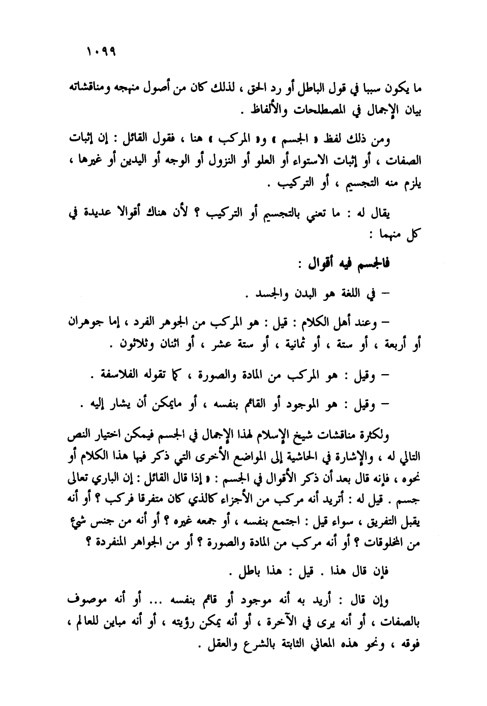 ومن ذلك لفظ "الجسم" و"المركب" هنا، القائل: إن إثبات الصفات، أو إثبات الاستواء أول العلو أو النزول أو الوجه أو اليدين وغيرها، يلزم منه التجسيم، أو التركيب.