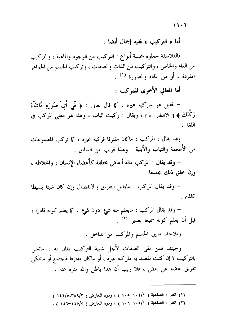 وحينئذ فمن نفى الصفات لأجل شبهة التركيب يقال له: ما تعني بالتركيب؟ إن كنت تقصد به ما ركبه غيره، أو ما كان مفترقا فاجتمع أو ما يمكن تفريق بعضه عن بعضن فلا ريب أن هذا باطل والله منزه عنه.