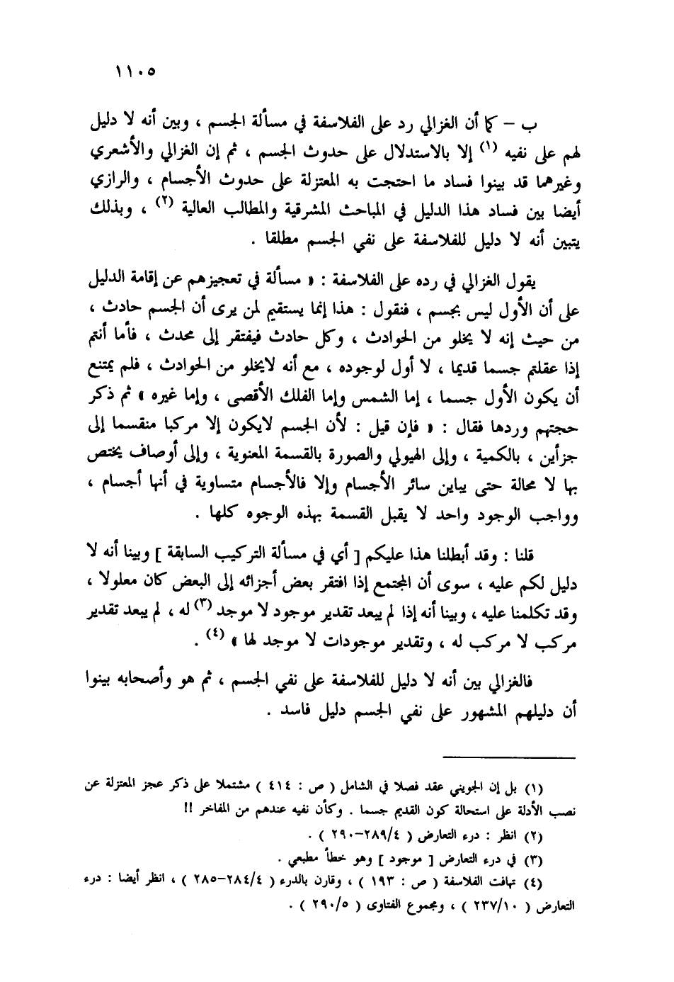 (¬4) تهافت الفلاسفة (ص: 193) ، وقارن بالدرء (4/284-285) ، انظر أيضاً: درء التعارض (10/237) ، ومجموع الفتاوى (5/290) .