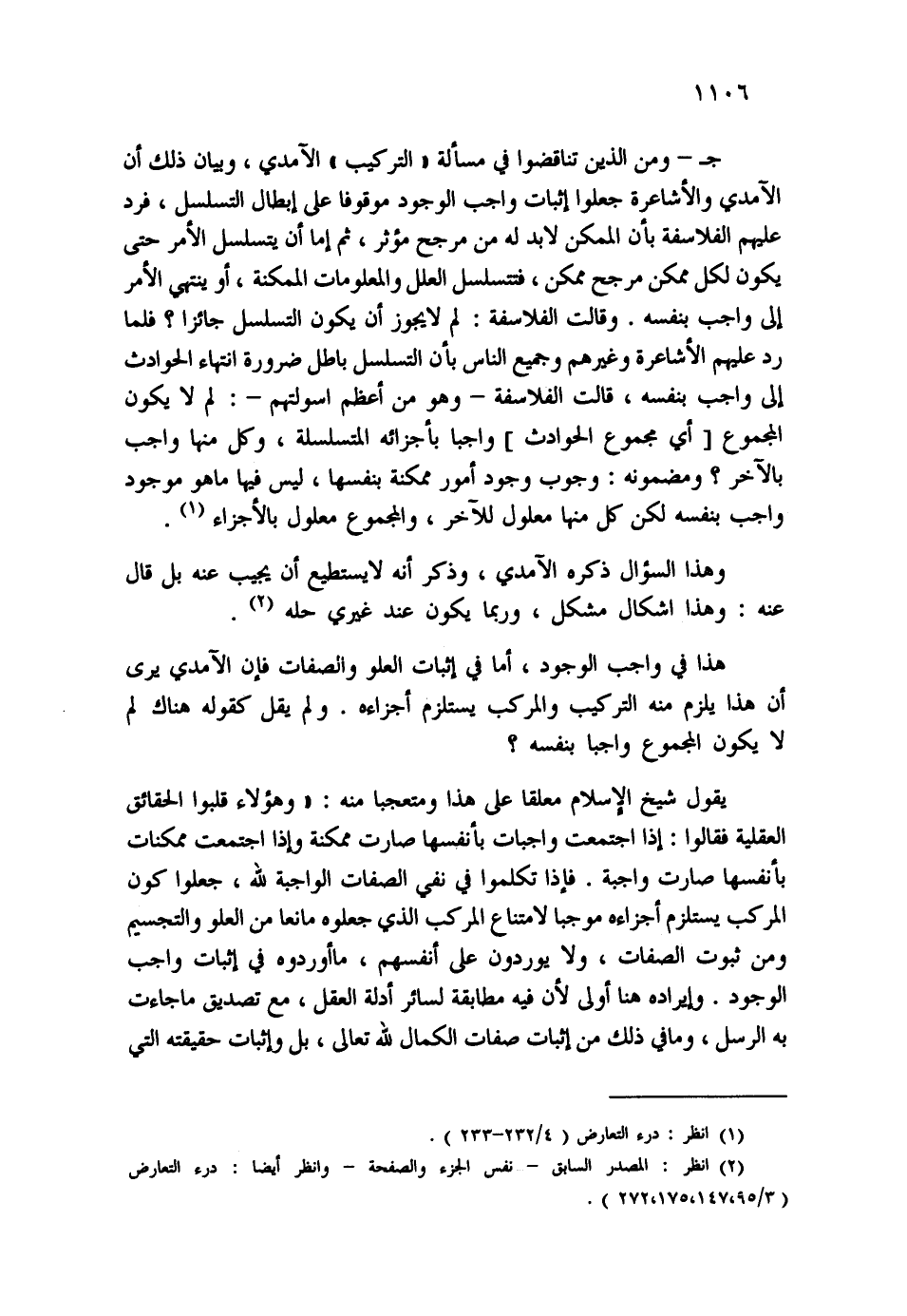 ج ومن الذين تناقضوا في مسألة "التركيب" الآمدي، وبيان ذلك أن الآمدي والأشاعرة جعلوا إثبات واجب الوجود موقوفا على إبطال التسلسل، فرد عليهم الفلاسفة بأن الممكن لا بد له من مرجح مؤثر، ثم إما أن يتسلسل الأمر حتى يكون لكل مرجح ممكن، فتتسلسل العلل والمعلومات الممكنة، أو ينتهي الأمر إلى واجب بنفسه. وقالت الفلاسفة: لم لا يجوز أن يكون التسلسل جائزاً؟ فلما رد عليهم الأشاعرة وغيرهم وجميع الناس بأن التسلسل باطل ضرورة انتهاء الحوادث إلى واجب بنفسه، قالت الفلاسفة - وهو من أعظم أسولتهم: لم لا يكون المجموع [أي مجموع الحوادث] واجباً بأجزائه المتسلسلة، وكل منها واجب بالآخر؟ ومضمونه: وجوب وجود أمور ممكنة بنفسها، ليس فيها ما هو موجود واجب بنفسه لكن كل منها معلول للآخر، والمجموع معلول بالأجزاء (¬1) .