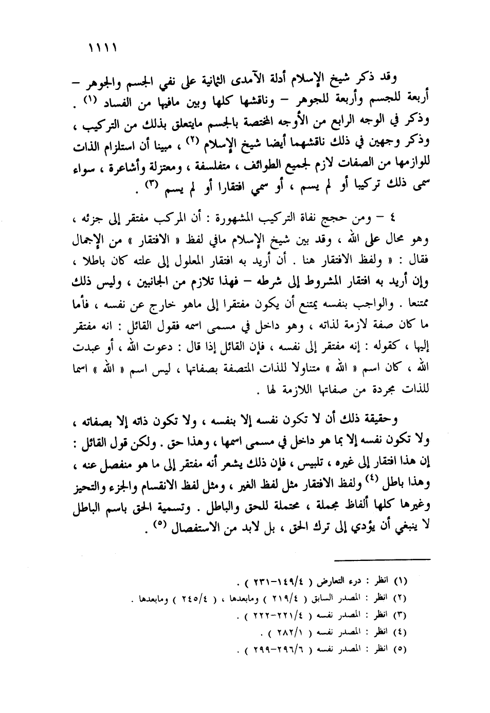 4- ومن حجج نفاة التركيب المشهورة: أن المركب مفتقر إلى جزئه، وهو محال على الله، وقد بين شيخ الإسلام ما في لفظ "الافتقار" من الإجمال فقال: "ولفظ الافتقار هنا. أن أريد به افتقار المعلول إلى علته كان باطلا، وإن أريد به افتقار المشروط إلى شرطه - فهذا تلازم من الجانبين، وليس ذلك ممتنعا. والواجب بنفسه يمتنع أن يكون مفتقرا إلى ما هو خارج عن نفسه، فأما ما كان صفة لازمة لذاته، وهو داخل في مسمى اسمه فقول القائل: إنه مفتقر إليها، كقوله: إنه مفتقر إلى نفسه، فإن القائل إذا قال: دعوت الله، أو عبدت الله، كان اسم "الله" متناولا للذات المتصفة بصفاتها، ليس اسم "الله" اسما للذات مجردة من صفاتها اللازمة لها.