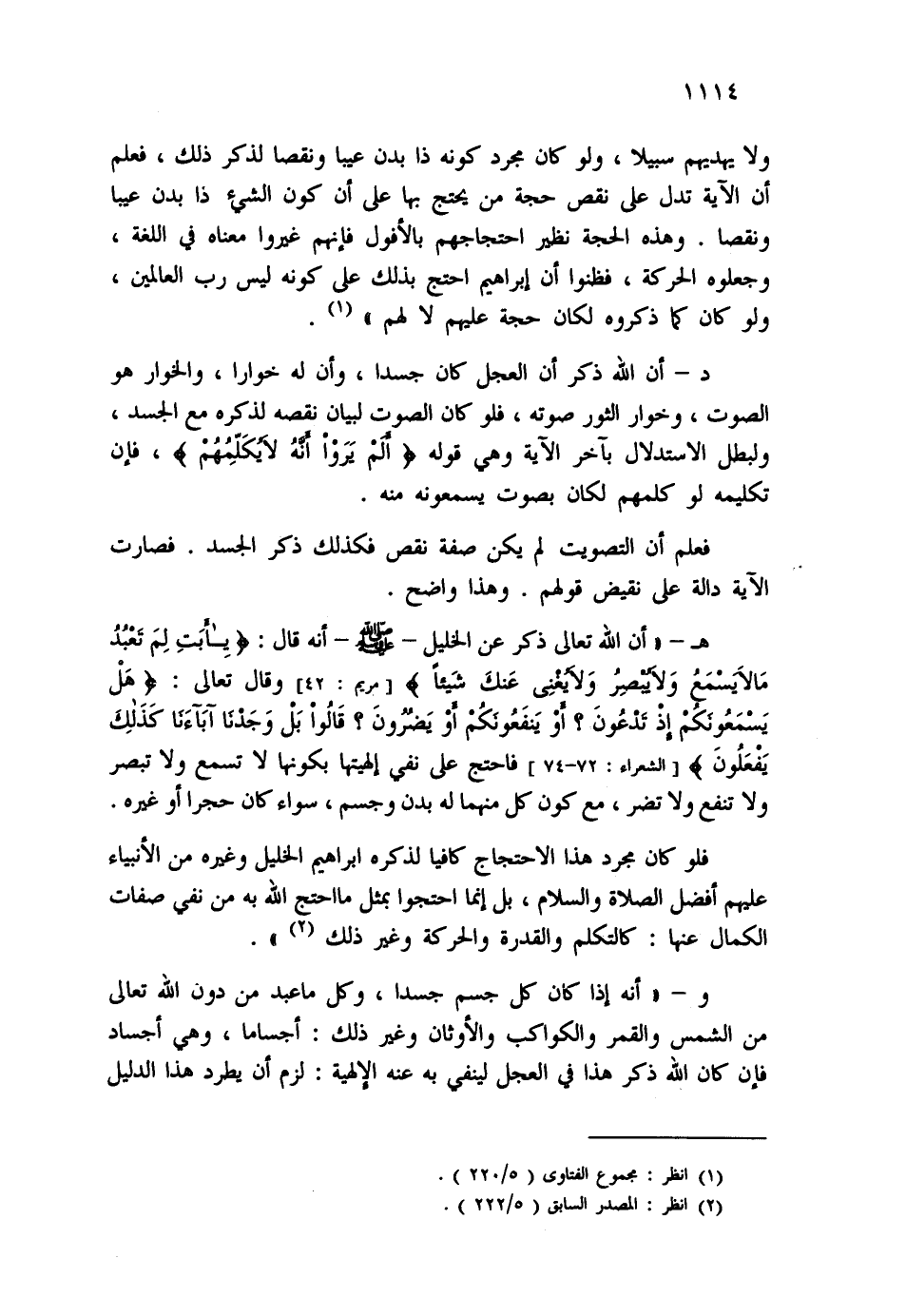 فلو كان مجرد هذا الاحتجاج كافياً لذكره إبراهيم الخليل وغيره من الأنبياء عليهم أفضل الصلاة والسلام، بل إنما احتجوا بمثل ما احتج الله به من نفي صفات الكمال عنها: كالتكلم والقدرة والحركة وغير ذلك (¬2) ".