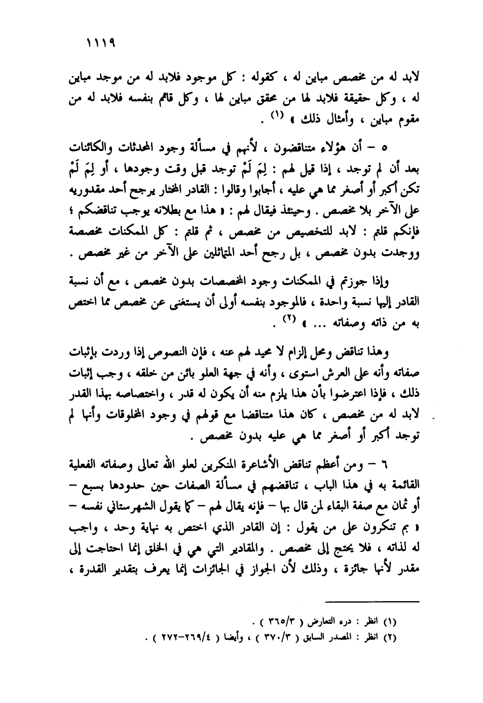 5- إن هؤلاء متناقضون، لأنهم في مسألة وجود المحدثات والكائنات بعد أن لم توجد، إذا قيل لهم: لم لم توجد قبل وقت وجودها، أو لم لم تكن أكبر أو أصغر مما هي عليه، أجابوا وقالوا: القادر المختار يرجح أحد مقدوريه على الآخر بلا مخصص. وحينئذ فيقال لهم: "هذا مع بطلانه يوجب تناقضكم؛ فإنكم قلتم: لا بد للتخصيص من مخصص، ثم قلتم: كل الممكنات مخصصة ووجدت بدون مخصص، بل رجح أحد المتماثلين على الآخر من غير مخصص.