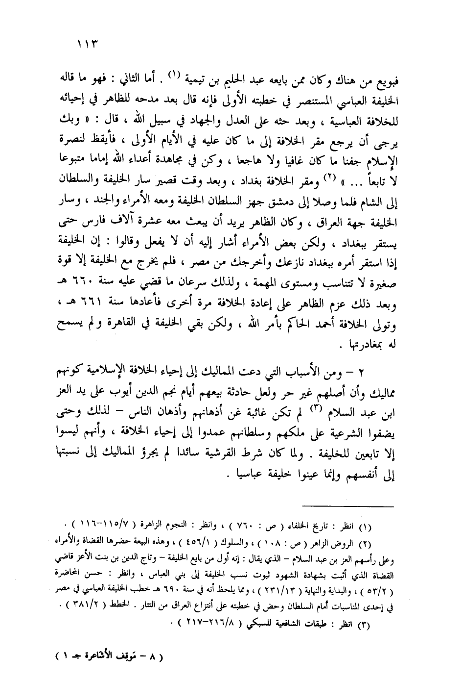(¬2) الروض الزاهر (ص: 108) ، والسلوك (1/456) ، وهذه البيعة حضرها القضاة والأمراء وعلى رأسهم العز بن عبد السلام- الذى يقال: إنه أول من بايع الخليفة- وتاج الدين بن بنت الأعز قاضي القضاة الذى أثبت بشهادة الشهود ثبوت نسب الخليفة إلى بني العباس، وانظر: حسن المحاضرة (2/53) ، والبداية والنهاية (13/231) ، ومما يلحظ أنه في سنة 690 هـ خطب الخليفة العباسي في مصر في إحدى المناسبات أمام السلطان وحض في خطبته على انتزاع العراق من التتار. الخطط (2/381) .