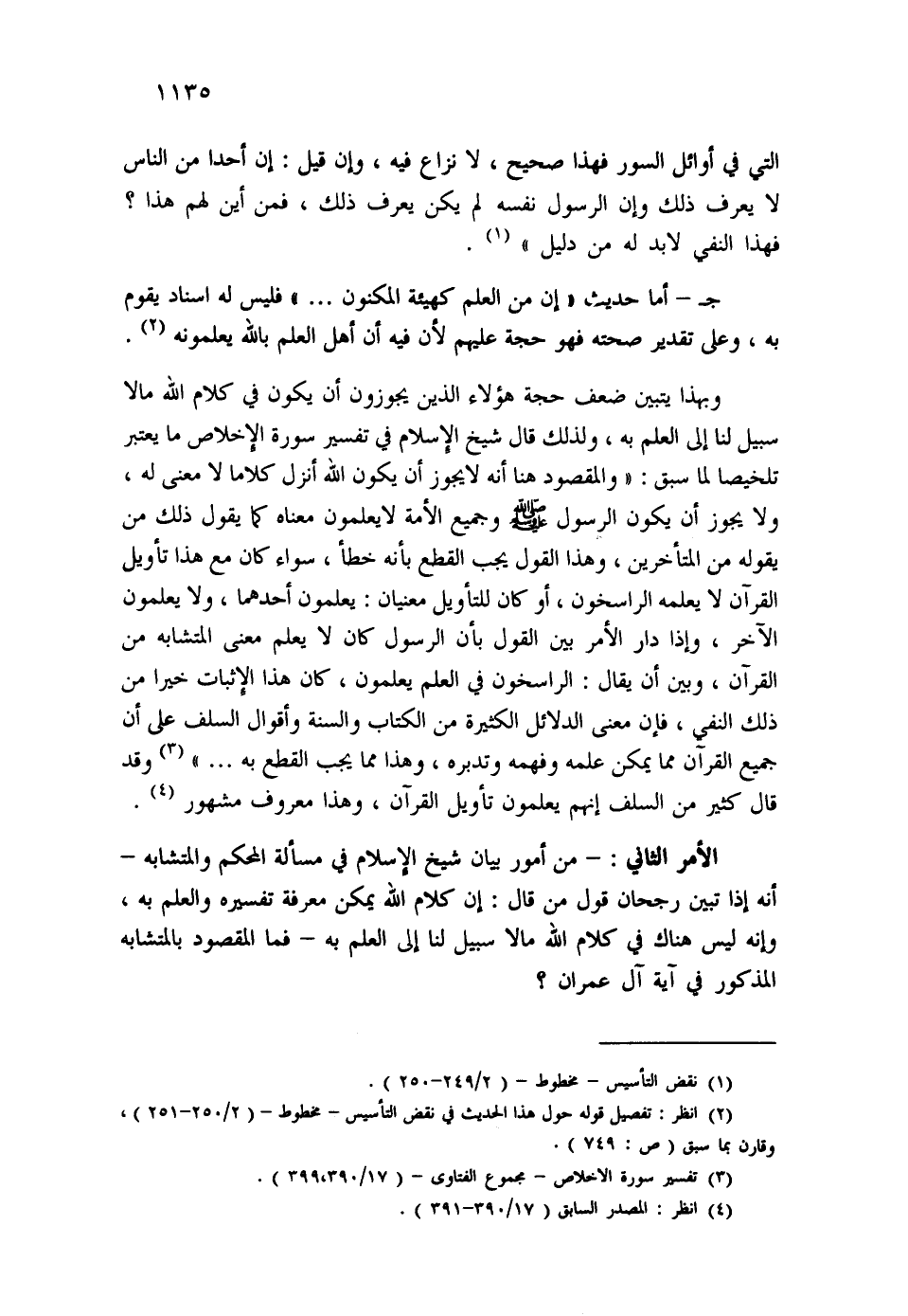 وبهذا يتبين ضعف حجة هؤلاء الذين يجوزون أن يكون في كلام الله مالا سبيل لنا إلى العلم به، ولذلك قال شيخ الإسلام في تفسير سورة الإخلاص ما يعتبر تلخيصاً لما سبق: "والمقصود هنا أنه لا يجوز أن يكون الله أنزل كلاما لا معنى له، ولا يجوز أن يكون الرسول - صلى الله عليه وسلم - وجميع الأمة لا يعلمون معناه كما يقول ذلك من يقوله من المتأخرين، وهذا القول يجب القطع بأنه خطأ، سواء كان مع هذا تأويل القرآن لا يعلمه الراسخون، أو كان للتأويل معنيان: يعلمون أحدهما، ولا يعلمون الآخر، وإذا دار الأمر بين القول بأن الرسول كان لا يعلم معنى المتشابه من القرآن، وبين أن يقال: الراسخون في العلم يعلمون، كان هذا الإثبات خيراً من ذلك النفي، فإن معنى الدلائل الكثيرة من الكتاب والسنة وأقوال السلف على أن جميع القرآن مما يمكن علمه وفهمه وتدبره، وهذا مما يجب القطع به ... " (¬3) وقد قال كثير من السلف إنهم يعلمون تأويل القرآن، وهذا معروف مشهور (¬4) .