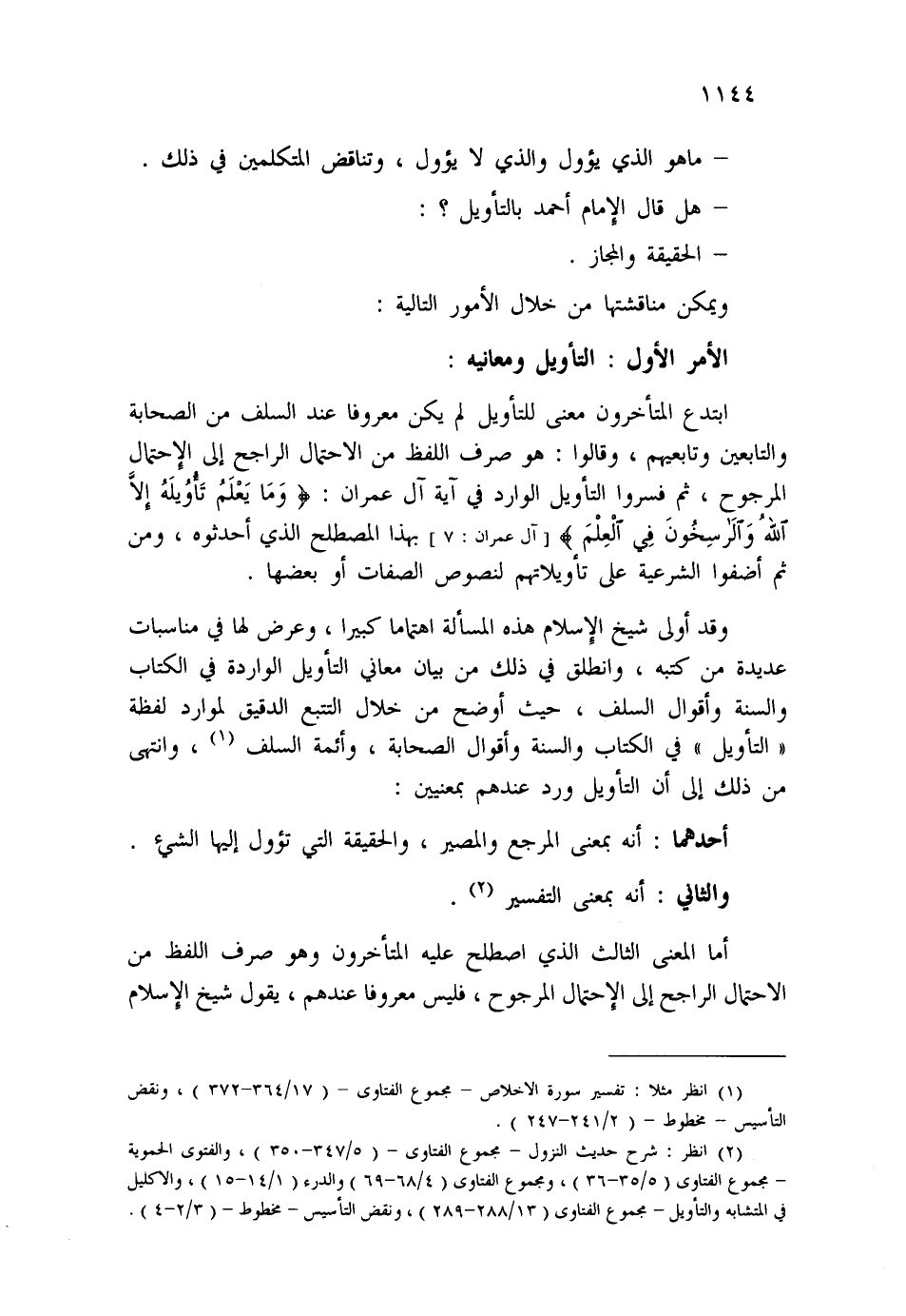وقد أولى شيخ الإسلام هذه المسألة اهتماما كبيراً، وعرض لها في مناسبات عديدة من كتبه، وانطلق في ذلك من بيان التأويل الواردة في الكتاب والسنة وأقوال السلف، حيث أوضح من خلال التتبع الدقيق لموارد لفظة "التأويل" في الكتاب والسنة وأقوال الصحابة، وأئمة السلف (¬1) ، وانتهى من ذلك إلى أن التأويل ورد عندهم بمعنيين: