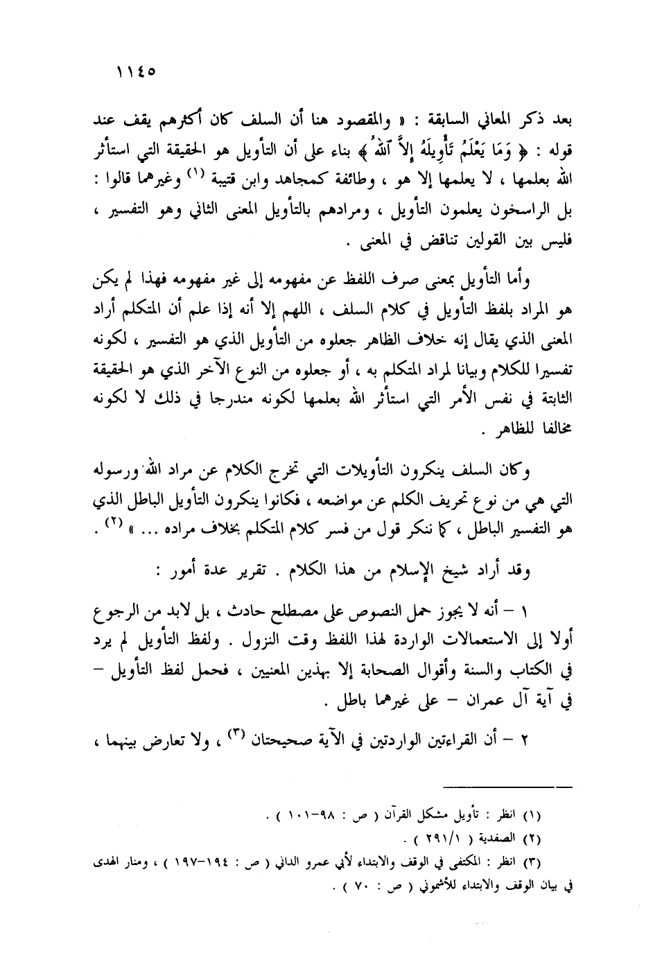 1- أنه لا يجوز حمل النصوص على مصطلح حادث، بل لا بد من الرجوع أولا إلى الاستعمالات الواردة لهذا اللفظ وقت النزول. ولفظ التأويل لم يرد في الكتاب والسنة وأقوال الصحابة إلا بهذين المعنيين، فحمل لفظ التأويل - في آية آل عمران - على غيرهما باطل.