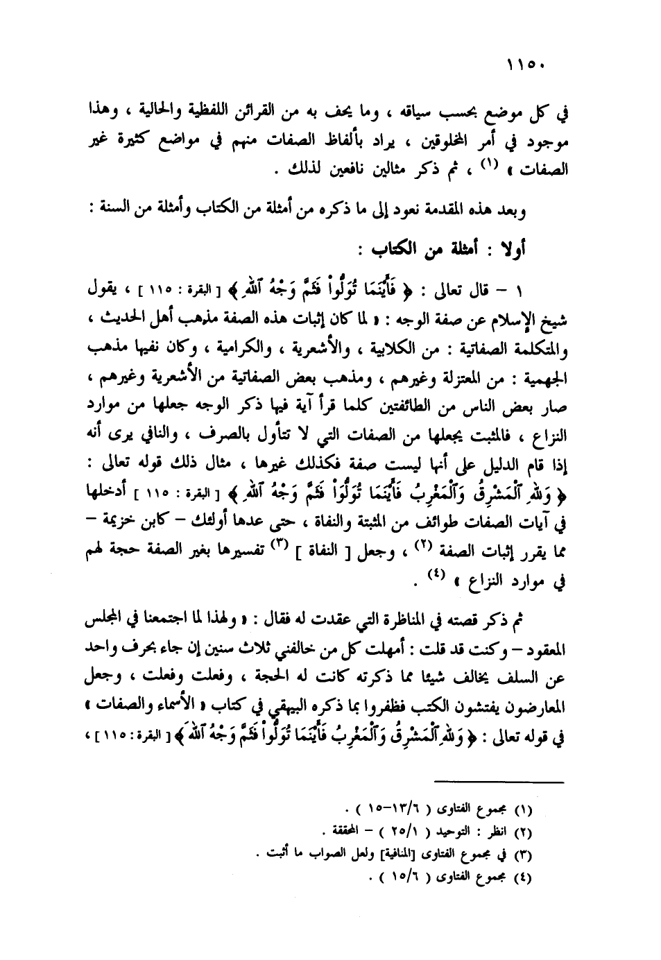 1- قال الله تعالى: {فَأَيْنَمَا تُوَلُّوا فَثَمَّ وَجْهُ اللَّهِ} (البقرة: من الآية115) ، ويقول شيخ الإسلام عن صفة الوجه: "لما كان إثبات هذه الصفة مذهب أهل الحديث، والمتكلمة الصفاتية: من الكلابية، والأشعرية، والكرامية، وكان نفيها مذهب الجهمية: من المعتزلة وغيرهم، ومذهب بعض الصفاتية من الأشعرية وغيرهم، صار بعض الناس من الطائفتين كلما قرأ آية فيها ذكر الوجه جعلها من موارد النزاع، فالمثبت يجعلها من الصفات التي لا تتأول بالصرف، والنافي يرى أنه إذا قام الدليل على أنه ليست صفة فكذلك غيرها، مثال ذلك قوله تعالى: {وَلِلَّهِ الْمَشْرِقُ وَالْمَغْرِبُ فَأَيْنَمَا تُوَلُّوا فَثَمَّ وَجْهُ اللَّهِ} (البقرة: من الآية115) أدخلها في آيات الصفات طوائف من المثبتة والنفاة، حتى عدها أولئك - كابن خزيمة - مما يقرر إثبات الصفة (¬2) ، وجعل [النفاة] (¬3) تفسيرها بغير الصفة حجة لهم في موارد النزاع" (¬4) .