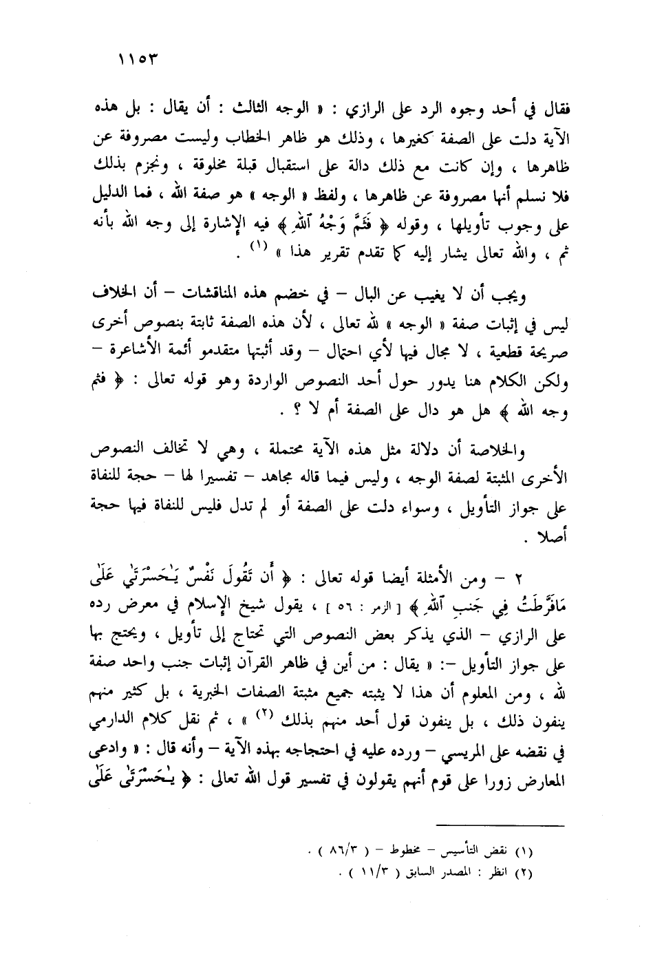 2- ومن الأمثلة أيضاً قوله تعالى: {أَنْ تَقُولَ نَفْسٌ يَا حَسْرَتَى عَلَى مَا فَرَّطْتُ فِي جَنْبِ اللَّهِ} (الزمر: من الآية56) ، يقول شيخ الإسلام في معرض رده على الرازي - الذي يذكر بعض النصوص التي تحتاج إلى تأويل، ويحتج بها على جواز التأويل: "يقال: من أين في ظاهر القرآن إثبات جنب واحد صفة لله، ومن المعلوم أن هذا لا يثبته جميع مثبتة الصفات الخبرية، بل كثير منهم ينفون ذلك، بل ينفون قول أحد منهم بذلك (¬2) "، ثم نقل كلام الدارمي في نقضه على المريسي - ورده عليه في احتجاجه بهذه الآية - وأنه قال: "وادعى المعارض زورا على قوم أنهم يقولون في تفسير قوله الله تعالى: {يَا حَسْرَتَى عَلَى