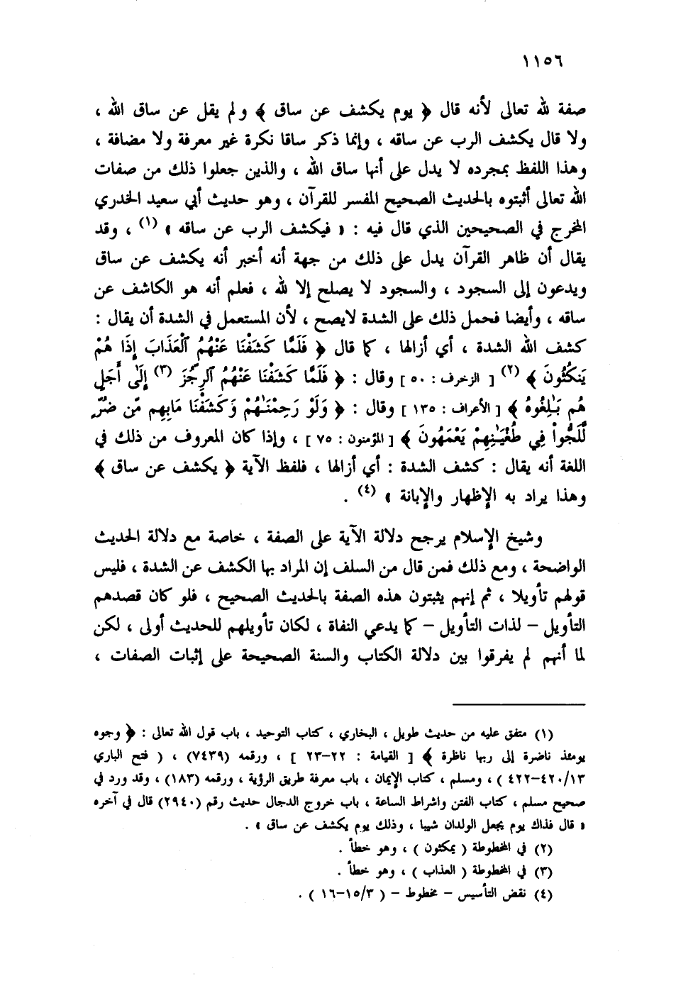 وشيخ الإسلام يرجح دلالة الآية على الصفة، خاصة مع دلالة الحديث الواضحة، ومع ذلك فمن قال من السلف إن المراد بها الكشف عن الشدة، فليس قولهم تأويلا، ثم إنهم يثبتون هذه الصفة بالحديث الصحيح، فلو كان قصدهم التأويل - لذات التأويل - كما يدعي النفاة، لكان تأويلهم للحديث أولى، لكن لما أنهم لم يفرقوا بين دلالة الكتاب والسنة الصحيحة على إثبات الصفات،