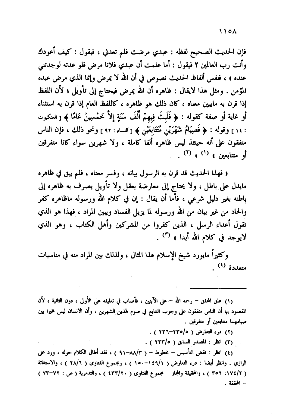 فإن الحديث الصحيح لفظه: عبدي مرضت فلم تعدني، فيقول: كيف أعودك وأنت رب العالمين؟ فيقول: أما علمت أن عبدي فلانا مرض فلو عدته لوجدتني عنده"، فنفس ألفاظ الحديث نصوص في أن الله لا يمرض وإنما الذي مرض عبده المؤمن. ومثل هذا لا يقال: ظاهره أن الله يمرض فيحتجا إلى تأويل؛ لأن اللفظ إذا قرن به ما يبين معناه، كان ذلك هو ظاهره، كاللفظ العام إذا قرن به استثناء أو غاية أو صفة كقوله: {فَلَبِثَ فِيهِمْ أَلْفَ سَنَةٍ إِلَّا خَمْسِينَ عَاما} (العنكبوت: من الآية14) وقوله: {فَصِيَامُ شَهْرَيْنِ مُتَتَابِعَيْن} (النساء: من الآية92) ونحو ذلك، فإن الناس متفقون على أنه حينئذ ليس ظاهره ألفا كاملة، ولا شهرين سواء كانا متفرقين أو متتابعين" (¬1) " (¬2) .