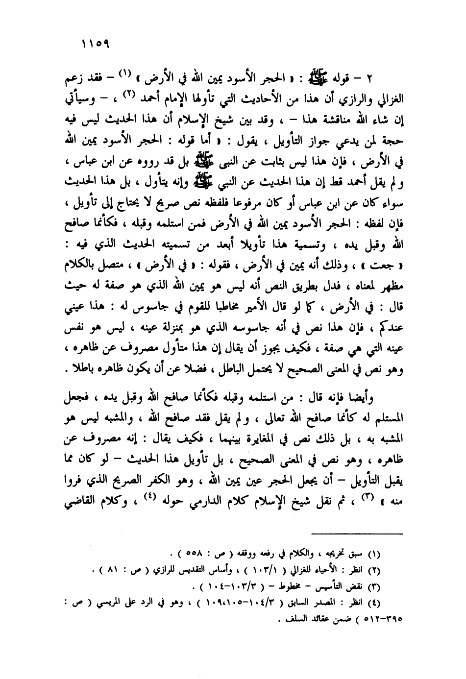 2- قوله - صلى الله عليه وسلم -: "الحجر الأسود يمين الله في الأرض" (¬1) - فقد زعم الغزالي والرازي أن هذا من الأحاديث التي تأولها الإمام أحمد (¬2) ، - وسيأتي إن شاء الله مناقشة هذا -، وقد بين شيخ الإسلام أن هذا الحديث ليس فيه حجة لمن يدعي جواز التأويل، يقول: "أما قوله: الحجر الأسود يمين الله في الأرض، فإن هذا ليس بثابت عن النبي - صلى الله عليه وسلم - بل قد روه عن ابن عباس، ولم يقل أحمد قط إن هذا الحديث عن النبي - صلى الله عليه وسلم - وإنه يتأول، بل هذا الحديث سواء كان عن ابن عباس أو كان مرفوعا فلفظه نص صريح لا يحتاج إلى تأويل، فإن لفظه: الحجر الأسود يمين الله في الأرض فمن استلمه وقبله، فكأنما صافح الله وقبل يده، وتسمية هذا تأويلا أبعد من تسميته الحديث الذي فيه: "جعت"، وذلك أنه يمين في الأرض، فقوله: "في الأرض"، متصل بالكلام مظهر لمعناه، فدل بطريق النص أنه ليس هو يمين الله الذي هو صفة له حيث قال: في الأرض، كما لو قال الأمير مخاطبا للقوم في جاسوس له: هذا عيني عندكم، فإن هذا نص في أنه جاسوسه الذي هو يمنزلة عينه، ليس هو نفس عينه التي هي صفة، فكيف يجوز أن يقال إن هذا متأول مصروف عن ظاهره، وهو نص في المعنى الصحيح لا يحتمل الباطل، فضلا عن أ، يكون ظاهره باطلا.