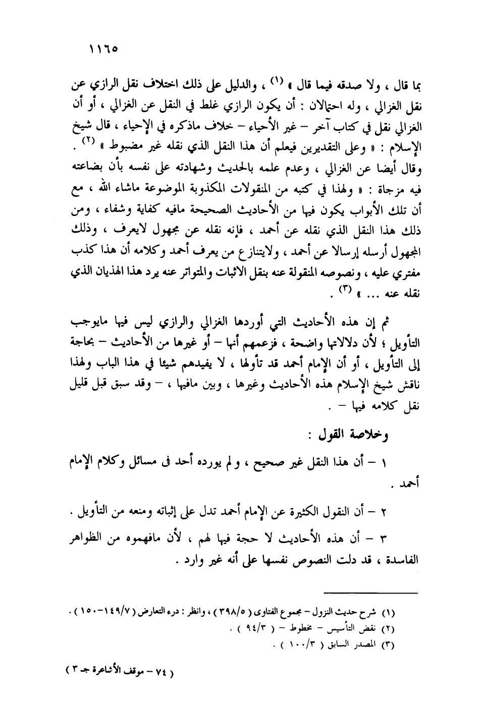 ثم إن هذه الأحاديث التي أوردها الغزالي والرازي ليس فيها ما يوجب التأويل؛ لأن دلالتها واضحة، فزعمهم أنها - أو غيرها من الأحاديث - بحاجة إلى التأويل، أو أن الإمام أحمد قد تأولها، لا يفيدهم شيئاً في هذا الباب ولهذا ناقش شيخ الإسلام هذه الأحاديث وغيرها، وبينا ما فيها، وقد سبق قبل قليل نقل كلامه فيها.