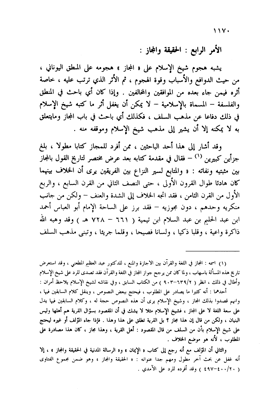 - فقال في مقدمة كتابه بعد عرض مختصر لتاريخ القول بالمجاز بين مثبتيه ونفاته: "والمتابع لسير النزاع بين الفريقين يرى أن الخلاف بينهما كان هادئاً طوال القرون الأولى، حتى النصف الثاني من القرن السابع، والربع الأول من القرن الثامن، فقد اتجه الخلاف إلى الشدة والعنف - ولكن من جانب منكريه وحدهم، دون مجوزيه - فقد برز على الساحة الإمام أبو العباس أحمد ابن عبد الحليم بن عبد السلام ابن تيمية (661-728هـ) وقد وهبه الله ذاكرة واعية، وقلبا ذكيا، ولسانا فصيحاً، وقلما جريئا، وتبنى مذهب السلف