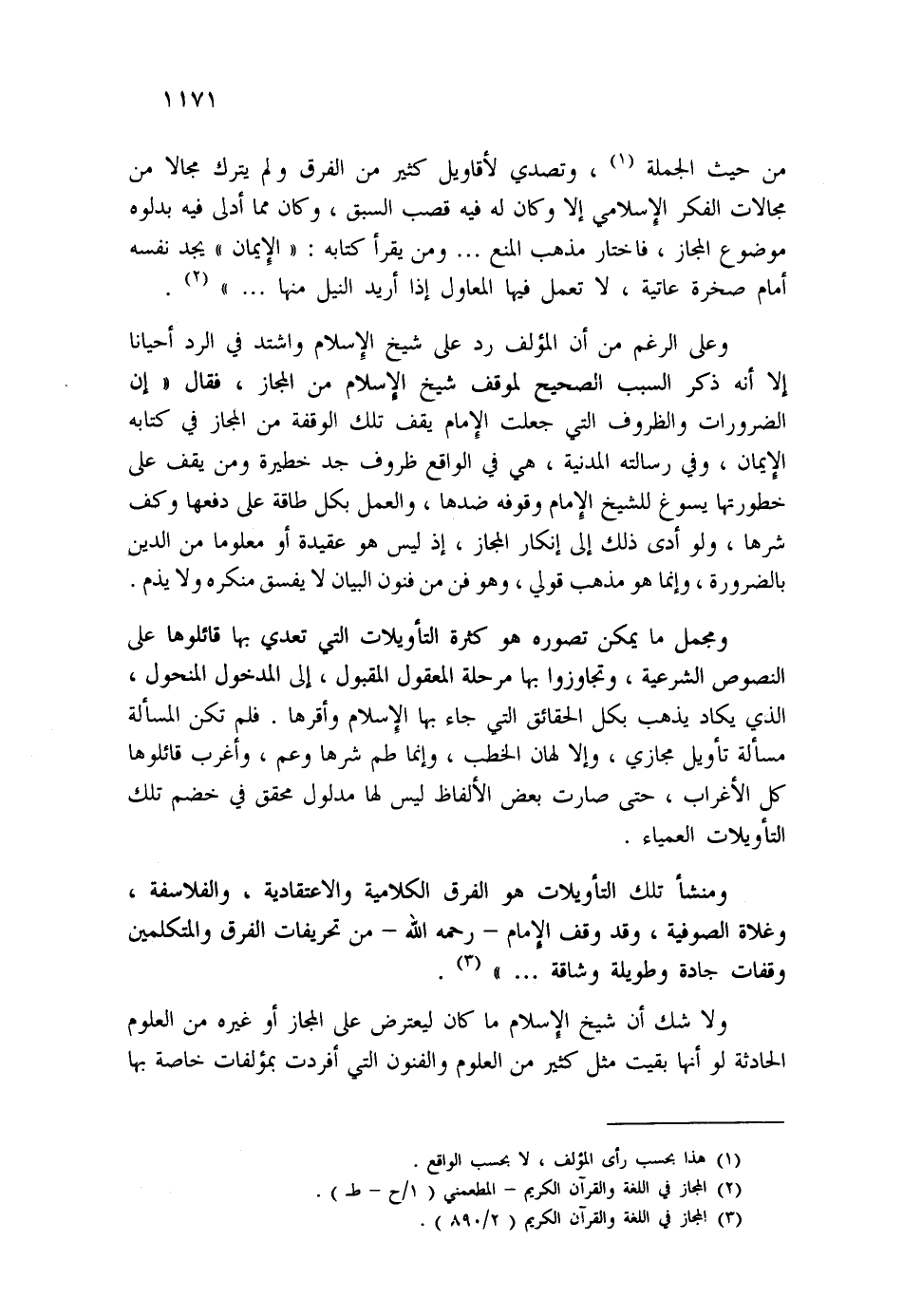 ولا شك أن شيخ الإسلام ما كان ليعترض على المجاز أو غيره من العلوم الحادثة لو أنها بقيت مثل كثير من العلوم والفنون التي أفردت بمؤلفات خاصة بها