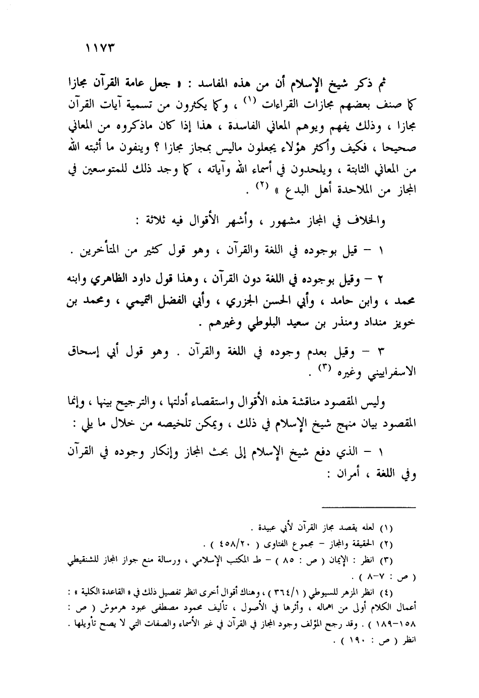 (¬3) انظر: الإيمان (ص:85) - ط المكتب الإسلامي، ورسالة منع جواز المجاز للشنقيطي (ص:7-8) .