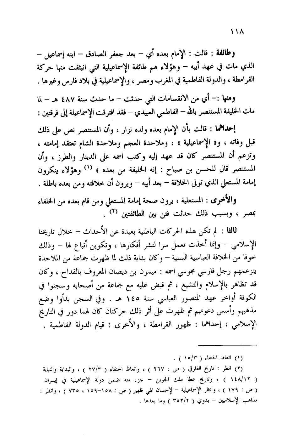ومنها:- أى من الانقسامات التي حدثت- ما حدث سنة 487 هـ- لما مات الخليفة المستنصر باللهـ الفاطمى العبيدى- فقد افترقت الإسماعيلة إلى فرقتين: