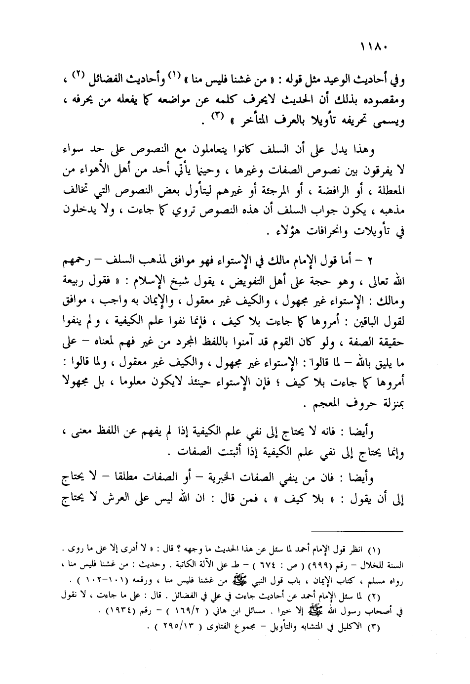 (¬1) انظر قول الإمام أحمد لما سئل عن هذا الحديث ما وجهه؟ قال: "لا أدري إلا على ما روى. السنة للخلال - رقم (999) (ص:674) - ط على الآلة الكاتبة. وحديث: من غشنا فليس منا، رواه مسلم، كتاب الإيمان، باب قول النبي - صلى الله عليه وسلم - من غشنا فليس منا، ورقمه (101-102) .