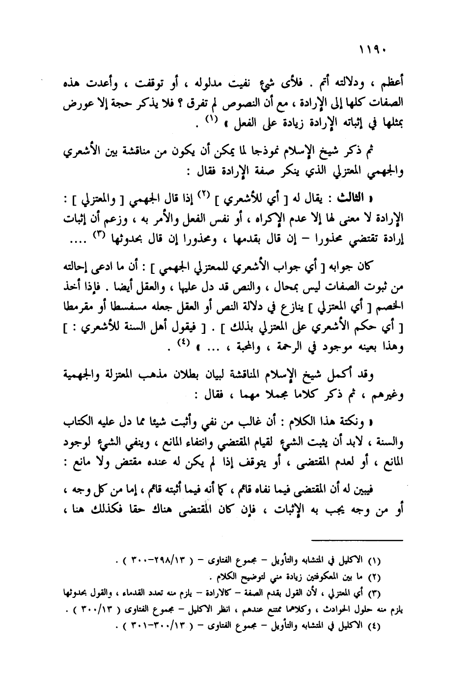 وقد أكمل شيخ الإسلام المناقشة لبيان بطلان مذهب المعتزلة والجهمية وغيرهم، ثم ذكر كلاما مجملا مهما، فقال: