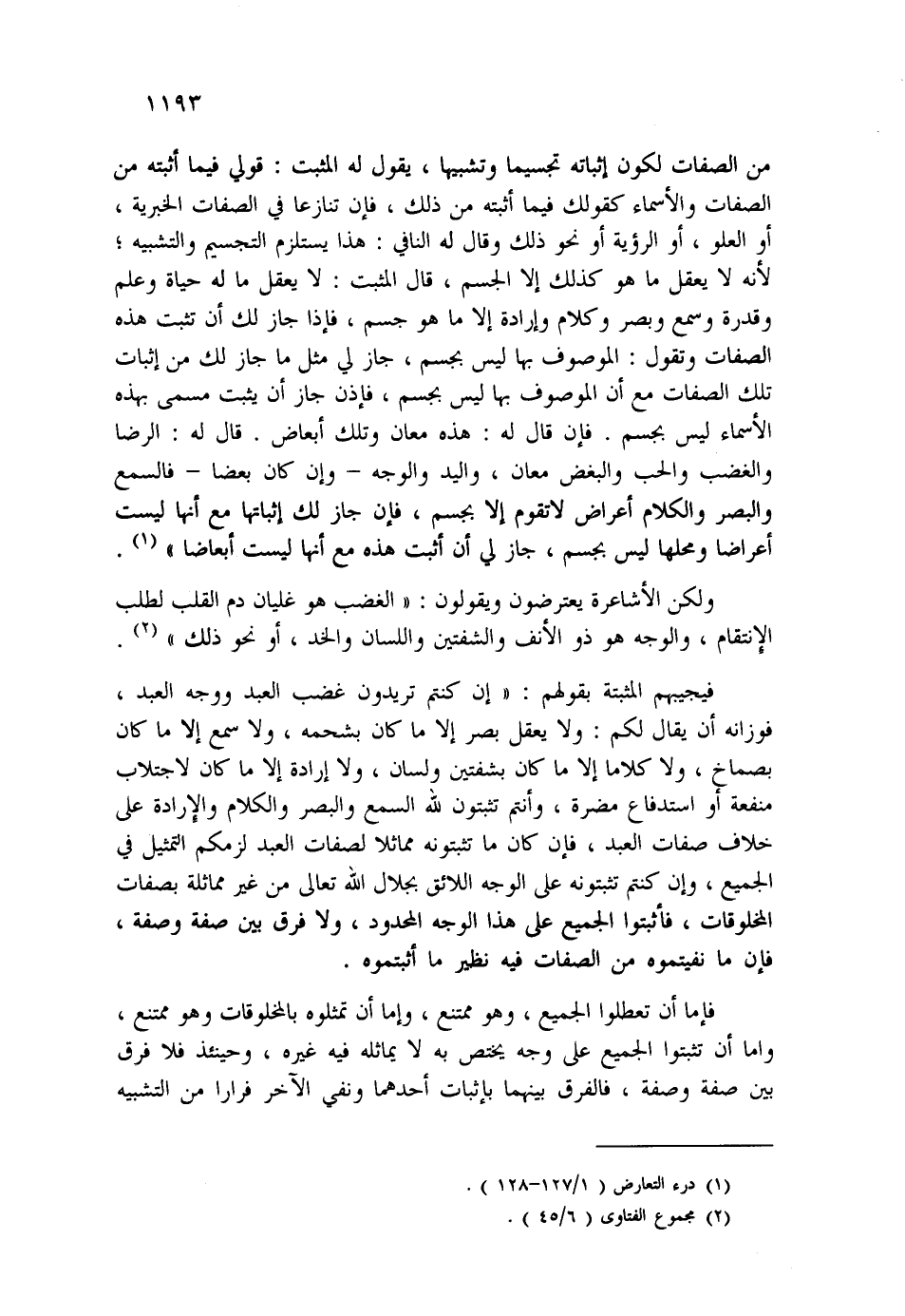 فيجيبهم المثبتة بقولهم: "إن كنتم تريدون غضب العبد ووجه العبد، فوزانه أن يقال لكم: ولا يعقل بصر إلا ما كان بشحمه، ولا سمع إلا ما كان بصماخ، ولا كلاما إلا ما كان بشفتين ولسان، ولا إرادة إلا ما كان لاجتلاب منفعة أو استدفاع مضرة، وأنتم تثبتون لله السمع والبصر والكلام والإرادة على خلاف صفات العبد، فإن كان ما تثبتونه مماثلا لصفات العبد لزمكم التمثيل في الجميع، وإن كنتم تثبتونه على الوجه اللائق بجلال الله تعال من غير مماثلة بصفات المخلوقات، فأثبتوا الجميع على هذا الوجه المحدود، ولا فرق بين صفة وصفة، فإن ما نفيتموه من الصفات فيه نظير ما أثبتموه.