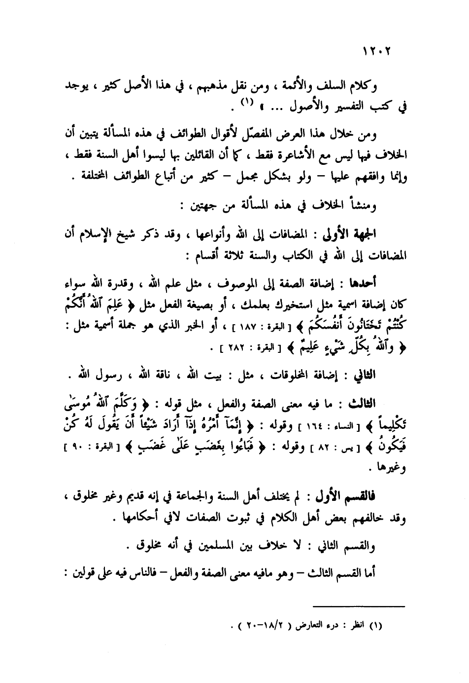 الجهة الأولى: المضافات إلى الله وأنواعها، وقد ذكر شيخ الإسلام أن المضافات إلى الله في الكتاب والسنة ثلاثة أقسام:
