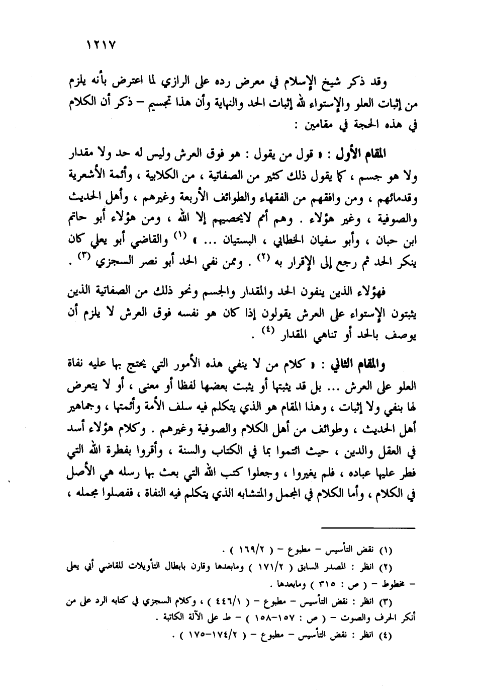المقام الأول: "قول من يقول: هو فوق العرش وليس له حد ولا مقدار ولا هو جسم، كما يقول ذلك كثير من الصفاتية، من الكلابية، وأئمة الأشعرية وقدمائهم، ومن وافقهم من الفقهاء والطوائف الأربعة وغيرهم، وأهل الحديث والصوفية، وغير هؤلاء. وهم أمم لا يحصيهم إلا الله، ومن هؤلاء أبو حاتم ابن حبان، وأبو سفيان الخطابي، البستيان ... " (¬1) والقاضي أبو يعلي كان ينكر الحد ثم رجع إلى الإقرار به (¬2) . وممن نفي الحد أبو نصر السجزي (¬3) .