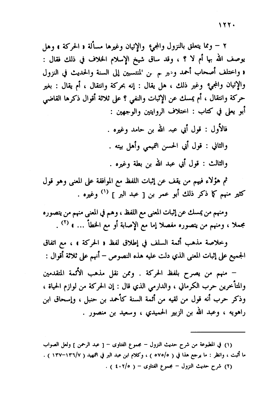 2- ومما يتعلق بالنزول والمجيء والإتيان وغيرها مسألة "الحركة" وهل يوصف الله بها أم لا؟، وقد ساق شيخ الإسلام الخلاف في ذلك فقال: "واختلف أصحاب أحمد وغيرهم من المنتسبين إلى السنة والحديث في النزول والإتيان والمجيء وغير ذلك، هل يقال: إنه بحركة وانتقال، أم يقال: بغير حركة وانتقال، أم يمسك عن الإثبات والنفي؟ على ثلاثة أقوال ذكرها القاضي أبو يعلى في كتاب: اختلاف الروايتين والوجهين: