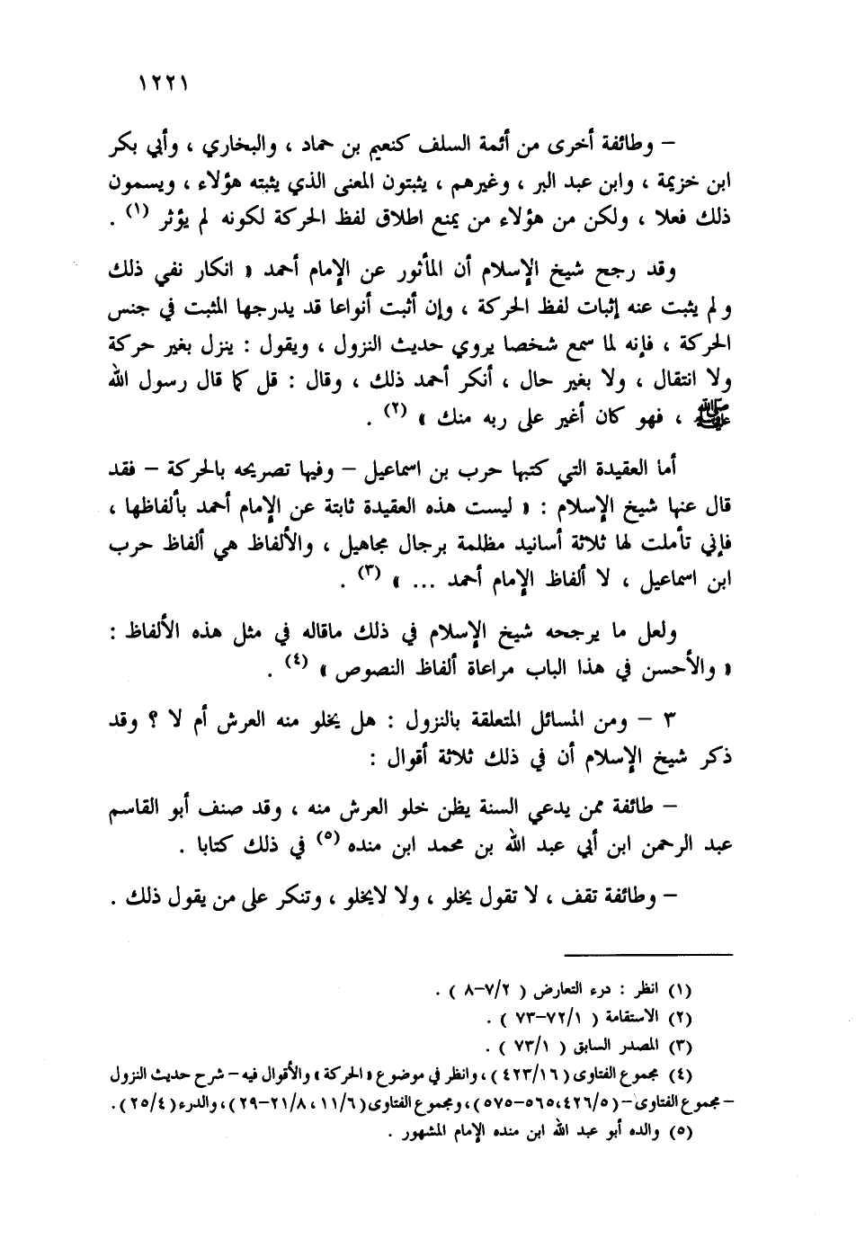 (¬4) مجموع الفتاوى (16/423) ، وانظر في موضوع "الحركة" والأقوال فيه - شرح حديث النزول - مجموع الفتاوى - (5/426،565-575) ، ومجموع الفتاوى (6/11،8/21-29) ، والدرء (4/25) .