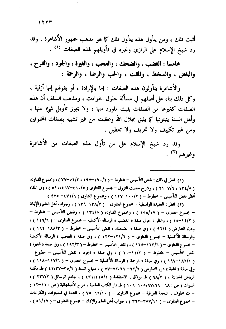 (¬2) انظر: العقيدة الواسطية - مجموع الفتاوى (3/138-139) ، وجواب أهل العلم والإيمان - مجموع الفتاوى - (17/158) ، ومجموع الفتاوى (5/134) ، ونقض التأسيس - مخطوط - (2/14-15) ، وانظر: حول صفة "الغضب" الرسالة الأكملية - مجموع الفتاوى (6/119) ، ودرء التعارض (4/92) ، وفي صفة "الضحك" نقض التأسيس - مخطوط - (3/188-192) ، والرسالة الأكملية - مجموع الفتاوى - (6/121-122) ، وفي صفة "العجب" الرسالة الأكملية - مجموع الفتاوى - (6/123-124) ، ونقض التأسيس - مخطوط - (3/192) ، وفي صفة "الغيرة" نقض التأسيس - مخطوط - (2/11-20) ، وفي صفة "الجود" نقض التأسيس - مطبوع - (1/186-197) ، وفي صفة "الرحمة" الرسالة الأكملية - مجموع الفتاوى (6/117-118) ، وفي صفة "المحبة" درء التعارض (6/62-66،72-77) ، منهاج السنة (2/35-37،42) ط مكتبة الرياض الحديثة، (3/98) طبولاق، الاستقامة (1/215،431) ، جامع الرسائل (2/237) ، النبوات (ص:68-69،97،105-109) ط دار الكتب العلمية، شرح الأصفهانية (ص:11-12) - ت مخلوف، التحفة العراقية - مجموع الفتاوى - (10/66-75) ، قاعدة في المعجزات والكرامات - مجموع الفتاوى - (11/357-362) ، جواب أهل العلم والإيمان - مجموع الفتاوى - (17/51) .
