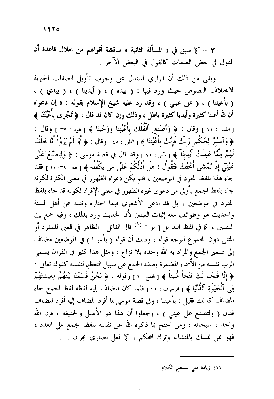 وبقي من ذلك أن الرازي استدل على وجوب تأويل الصفات الخبرية لاختلاف النصوص حيث ورد فيها: (بيده) ، (أيدينا) ، (بيدي) ، (بأعيننا) ، (على عيني) ، وقد رد عليه شيخ الإسلام بقوله: "إن دعواه أن لله أعينا كثيرة وأيديا كثيرة باطل، وذلك وإن كان قد قال: {تَجْرِي بِأَعْيُنِنَا} (القمر: من الآية14) وقال: {وَاصْنَعِ الْفُلْكَ بِأَعْيُنِنَا وَوَحْيِنَا} (هود: من الآية37) وقال: {وَاصْبِرْ لِحُكْمِ رَبِّكَ فَإِنَّكَ بِأَعْيُنِنَا} (الطور: من الآية48) وقال: {أَوَلَمْ يَرَوْا أَنَّا خَلَقْنَا لَهُمْ مِمَّا عَمِلَتْ أَيْدِينَا} (يّس: من الآية71) وقد قال في قصة موسى: {وَلِتُصْنَعَ عَلَى عَيْنِي * إِذْ تَمْشِي أُخْتُكَ فَتَقُولُ هَلْ أَدُلُّكُمْ عَلَى مَنْ يَكْفُلُهُ} (طه: من الآية 39-40) فقد جاء هذا بلفظ المفرد في الموضعين، فلم يكن دعواه الظهور في معنى الكثرة لكونه جاء بلفظ الجمع بأولى من دعوى غيره الظهور في معنى الإفراد لكونه قد جاء بلفظ المفرد في موضعين، بل قد ادعى الأشعري فيما اختاره ونقله عن أهل السنة والحديث هو وطوائف معه إثبات العينين لأن الحديث ورد بذلك~، وفيه جمع بين النصين، ما في لفظ اليد بل [لو] (¬1)