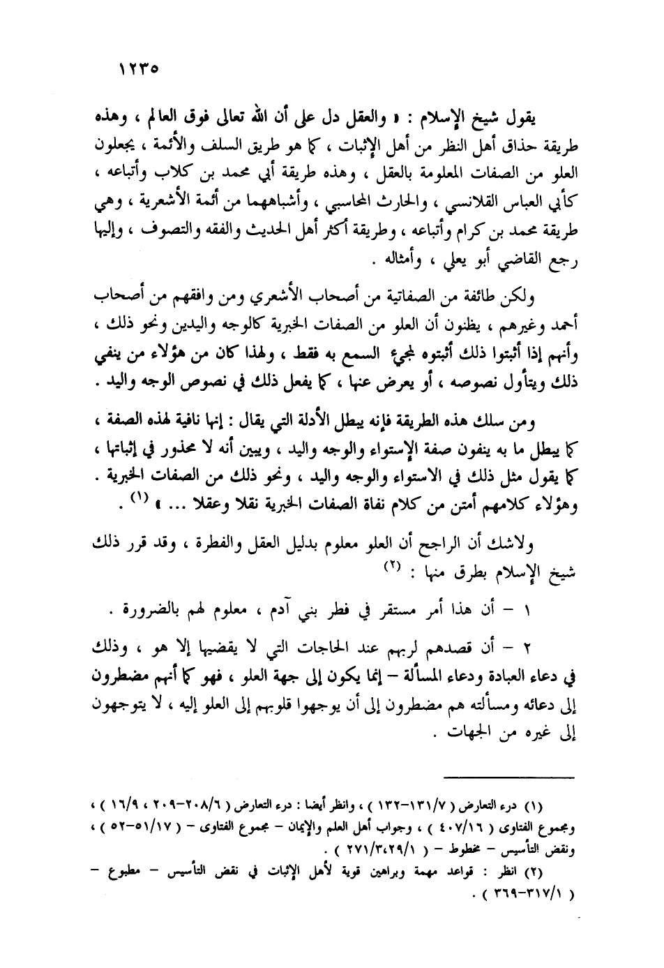 يقول شيخ لاإسلام: "والعقل دل على أن الله تعالى فوق العالم، وهذه طريقة حذاق أهل النظر من أهل الإثبات، كما هو طريق السلف والأئمة، يجعلون العلو من الصفات المعلومة بالعقل، وهذه طريقة أبي محمد بن كلاب وأتباعه، كأبي العباس الفلانسي، والحارث المحاسبي، وأشباههما من أئمة الأشعرية، وهي طريقة محمد بن كرام وأتباعه، وطريقة أكثر أهل الحديث والفقه والتصوف، وإليها رجع القاضي أبو يعلي، وأمثاله.