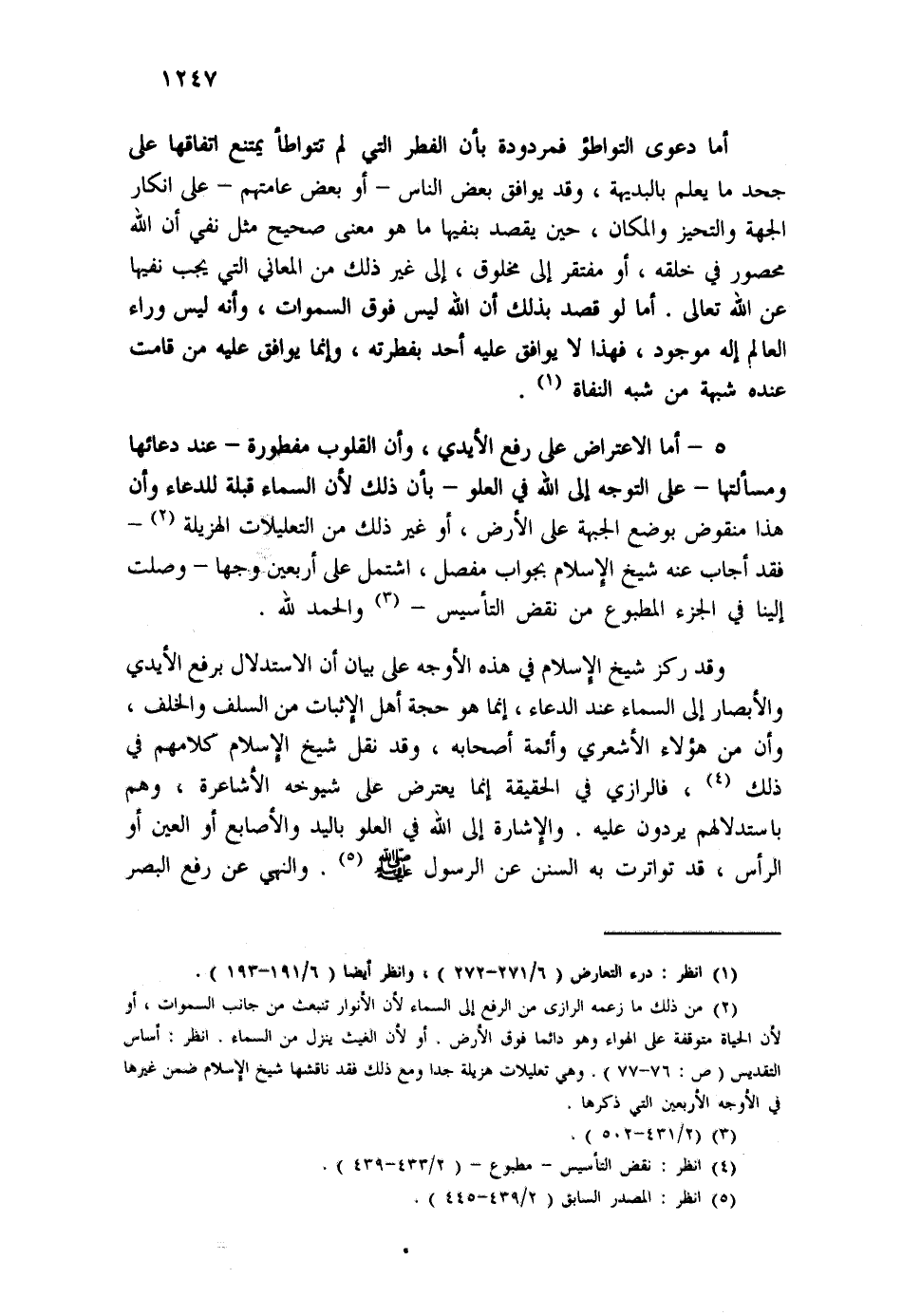 5- أما الاعتراض على رفع الأيدي، وأن القلوب مفطورة - عند دعائها ومسألتها - على التوجه إلى الله في العلو - بأن ذلك لأن السماء قبلة للدعاء وأن هذا منقوض بوضع الجبهة على الأرض، أو غير ذلك من التعليلات الهزيلة (¬2) - فقد أجاب عنه شيخ الإسلام بجواب مفصل، اشتمل على أربعين وجها - وصلت إلينا في الجزء المطبوع من نقض التأسيس - (¬3) والحمد لله.