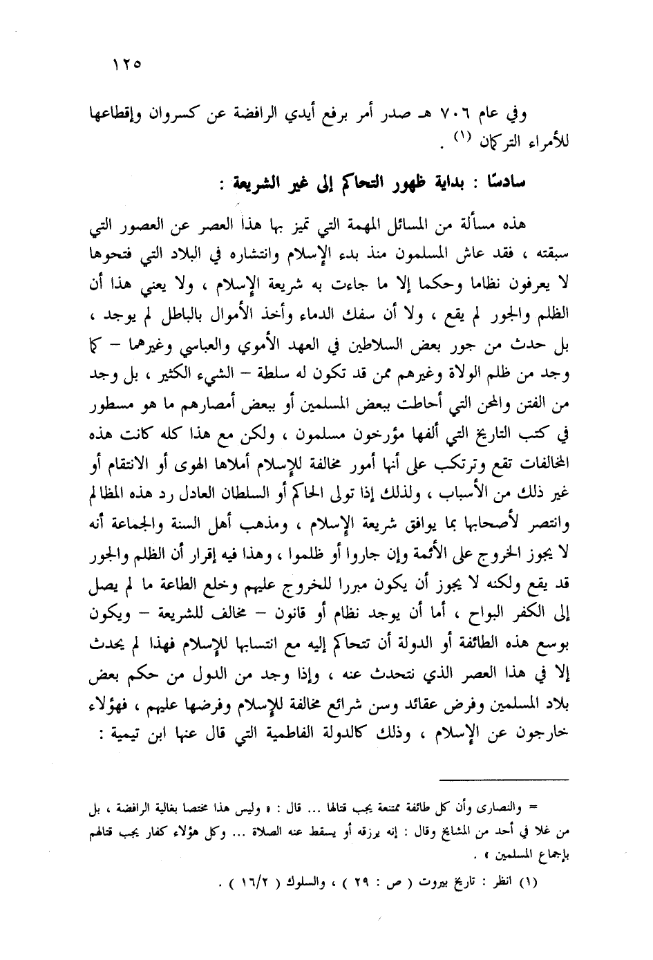 هذه مسألة من المسائل المهمة التي تميز بها هذا العصر عن العصور التي سبقته، فقد عاش المسلمون منذ بدء الإسلام وانتشاره في البلاد التي فتحوها لا يعرفون نظاما وحكما إلا ما جاءت به شريعة الاسلام، ولا يعني هذا أن الظلم والجور لم يقع، ولا أن سفك الدماء وأخذ الأموال بالباطل لم يوجد، بل حدث من جور بعض السلاطين في العهد الأموي والعباسي وغيرهما- كما وجد من ظلم الولاة وغيرهم ممن قد تكون له سلطة- الشىء الكثير، بل وجد من الفتن والمحن التي أحاطت ببعض المسلمين أو ببعض أمصارهم ما هو مسطور في كتب التاريخ التى ألفها مؤرخون مسلمون، ولكن مع هذا كله كانت هذه المخالفات تقع وترتكب على أنها أمور مخالفة للإسلام أملاها الهوى أو الانتقام أو غير ذلك من الأسباب، ولذلك إذا تولى الحاكم أو السلطان العادل رد هذه المظا لم وانتصر لأصحابها بما يوافق شريعة الإسلام، ومذهب أهل السنة والجماعة أنه لا يجوز الخروج على الأئمة وإن جاروا أو ظلموا، وهذا فيه إقرار أن الظلم والجور قد يقع ولكنه لا يجوز أن يكون مبررا للخروج عليهم وخلع الطاعة ما لم يصل إلى الكفر البواح، أما أن يوجد نظام أو قانون- مخالف للشريعة- ويكون بوسع هذه الطائفة أو الدولة أن تتحاكم إليه مع انتسابها للإسلام فهذا لم يحدث إلا في هذا العصر الذي نتحدث عنه، وإذا وجد من الدول من حكم بعض بلاد المسلمين وفرض عقائد وسن شرائع مخالفة للاسلام وفرضها عليهم، فهؤلاء خارجون عن الإسلام، وذلك كالدولة الفاطمية التي قال عنها ابن تيمية: