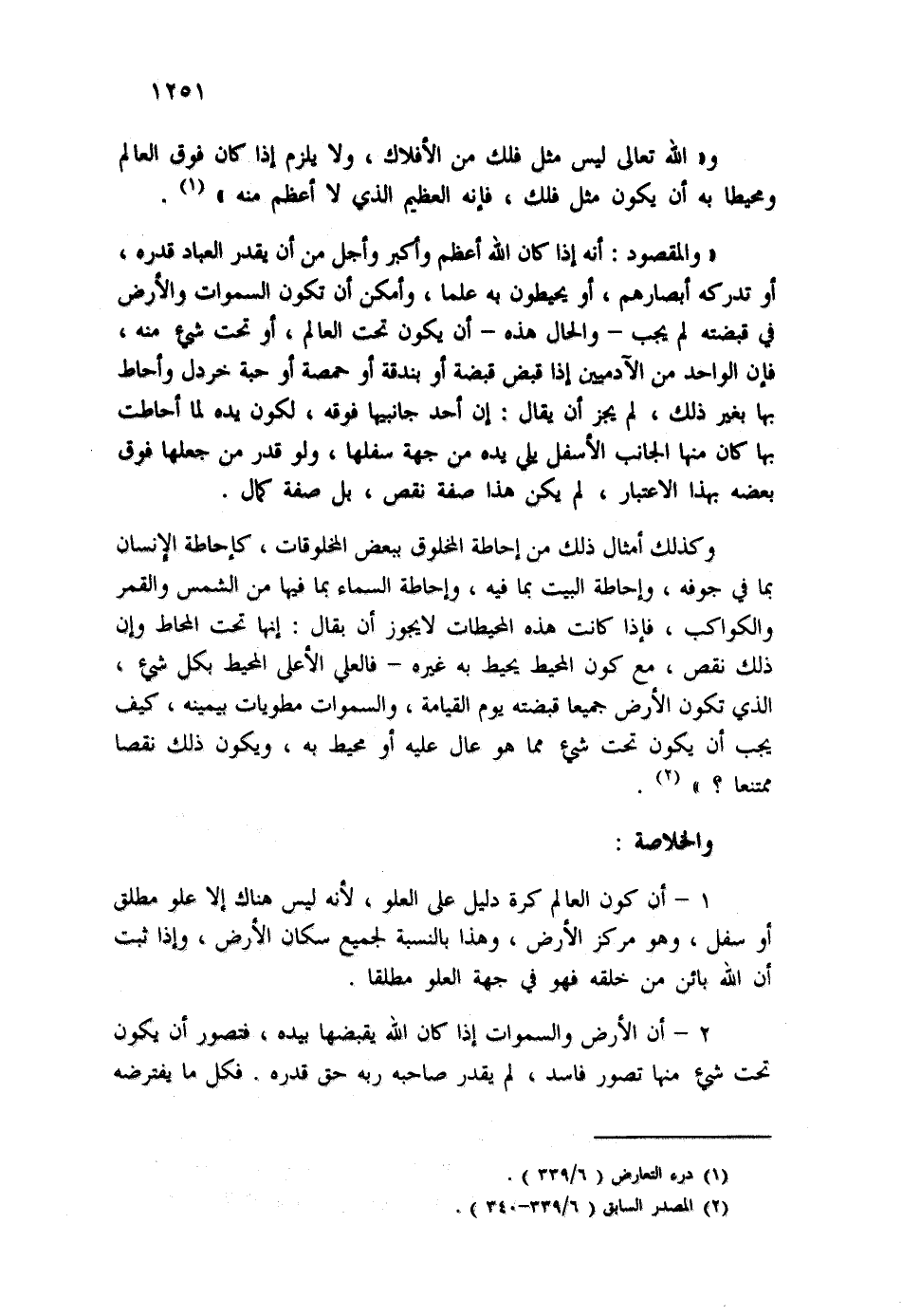وكذلك أمثال ذلك من إحاطة المخلوق ببعض المخلوقات، كإحاطة الإنسان بما في جوفه، وإحاطة البيت بما فيه، وإحاطة السماء فيها من الشمس والقمر والكواكب، فإذا كانت هذه المحيطات لا يجوز أن يقال: إنها تحت المحاط وإن ذلك نقص، مع كون المحيط يحيط به غيره - فالعلي الأعلى المحيط بكل شيء، الذي تكون الأرض جميعا قبضته يوم القيامة، والسموات مطويات بيمينه، كيف يجب أن يكون تحت شيء مما هو عال عليه أو محيط به، ويكون ذلك نقصا ممتنعا؟ " (¬2) .