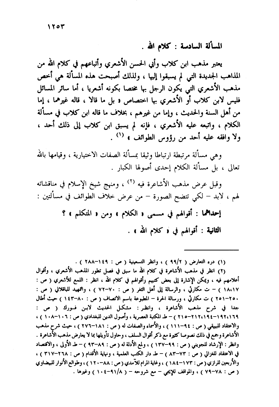(¬2) انظر في مذهب الأشاعرة في كلام الله ما سبق في فصل تطور المذهب الأشعري، وأقوال أعلامهم فيه، ويمكن الإشارة إلى بعض كتبهم وأقوالهم في كلام الله، انظر: اللمع للأشعري (ص:17-18) ت مكارثي، والرسالة إلى أهل الثغر (ص:70-72) ، والتمهيد للباقلاني (ص:250-251) ت مكارثي، ورسالة الحرة - المطبوعة باسم الاتصاف (ص:80-143) حيث أطال جدا في شرح مذهب الأشاعرة، وانظر: مشكل الحديث لابن فورك (ص:169-192-194، 212-215) ، ط المكتبة العصرية، وأصول الدين للبغدادي (ص:106-108) ، والاعتقاد للبيهقي (ص:94-111) ، والأسماء والصفات له (ص:181-276) ، حيث شرح مذهب الأشاعرة وجمع في ذلك نصوصا كثيرة مع ذكر أقوال السلف، وحاول تأويلهابما لا يعارض مذهب الأشاعرة. وانظر: الإرشاد للجويني (ص:99-137) ، ولمع الأدلة له (ص:89-93) ط الأولى، والاقتصاد في الاعتقاد للغزالي (ص:73-83) ط دار الكتب العلمية، ونهاية الأقدام (ص: 268-317) ، والأربعين للرازي (صك173-184) ، وغاية المرام للآمدي (ص:88-120) ، وطوالع الأنوار للبيضاوي (ص:78-79) ، والمواقف للإيجي - مع شروحه - (8/91-104) وغيرها.