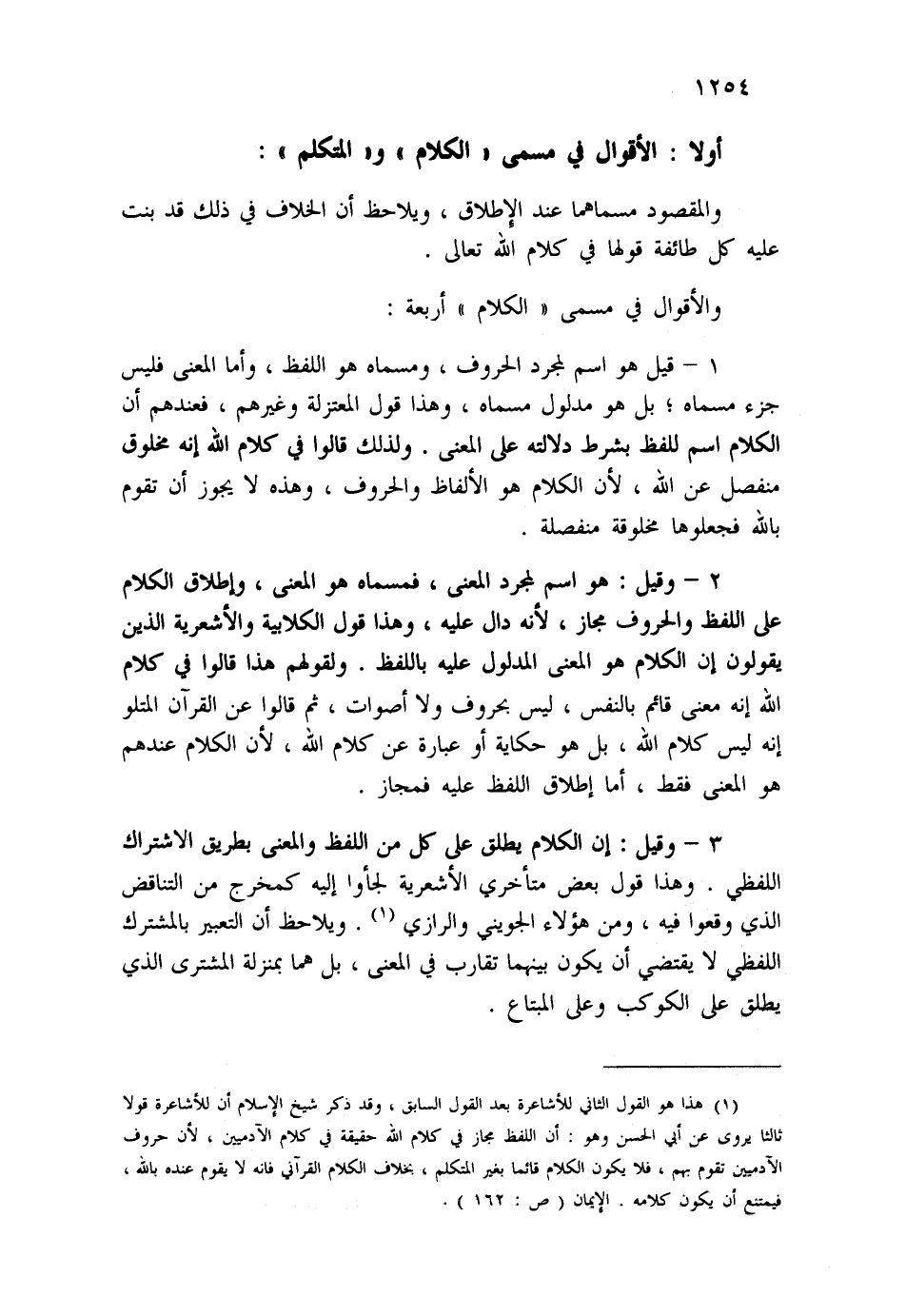 3- وقيل: إن الكلام يطلق على كل من اللفظ والمعنى بطريق الاشتراك اللفظي. وهذا قول بعض متأخري الأشعرية لجأوا إليه كمخرج من التناقض الذي وقعوا فيه، ومن هؤلاء الجويني والرازي (¬1) . ويلاحظ أن التعبير بالمشترك اللفظي لا يقتضي أن يكون بينهما تقارب في المعنى، بل هما يمنزلة المشتري الذي يطلق على الكوكب وعلى المبتاع.