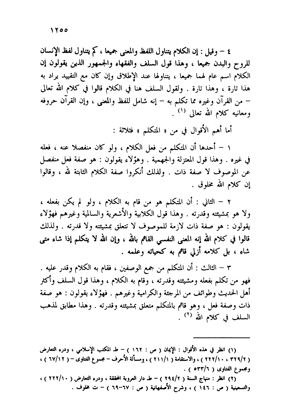 3- الثالث: أن المتكلم من جمع الوصفين، فقام به الكلام وقدر عليه. فهو من تكلم بفعله ومشيئته وقدرته، وقام به الكلام، وهذا قول السلف وأكثر أهل الحديث وطوائف من المرجئة والكرامية متعلق بمشيئته وقدرته. وهذا مطابق لمذهب السلف في كلام الله (¬2) .