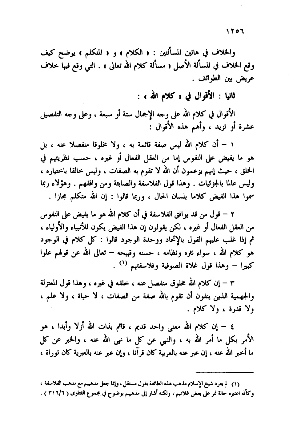 1- أن كلام الله ليس صفة قائمة به، ولا مخلوقا منفصلا عنه، بل هو ما يفيض على النفوس إما من العقل الفعال أو غيره، حسب نظريتهم في الخلق، حيث إنهم يزعمون أن الله لا تقوم به الصفات، وليس خالقا باختياره، وليس عالما بالجزيئات. وهذا قول الفلاسفة والصائبة ومن وافقهم. وهؤلاء ربما سموا هذا الفيض كلاما بلسان الحال، وربما قالوا: إن الله متكلم مجازا.