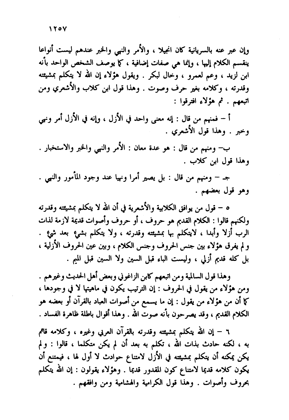 وإن عبر عنه بالسريانية كان إنجيلا، والأمر والنهي والخبر عندهم ليست أنواعا ينقسم الكلام إليها، وإنما هي صفات إضافية، كما يوصف الشخص الواحد بأنه ابن لزيد، وعم لعمرو، وخال برك. ويقول هؤلاء إن الله لا يتكلم بمشيئته وقدرته، وكلامه بغير حرف وصوت. وهذا قول ابن كلاب والأشعري ومن اتبعهم. ثم هؤلاء افترقوا:
