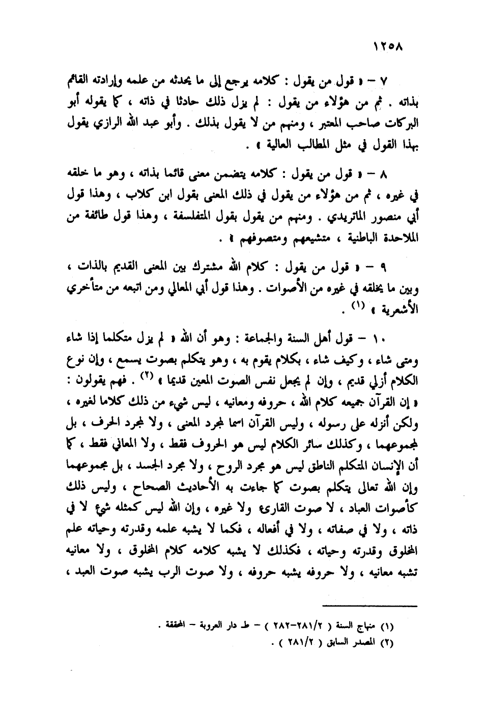 7- "قول من يقولك كلامه يرجع إلى ما يحدثه من علمه وإرادته القائم بذاته. ثم من هؤلاء من يقول: لم يزل ذلك حادثا في ذاته، كما يقوله أبو البركات صاحب المعتبر، ومنهم من لا يقول بذلك. وأبو عبد الله الرازي يقول بهذا القول في مثل المطالب العالية".