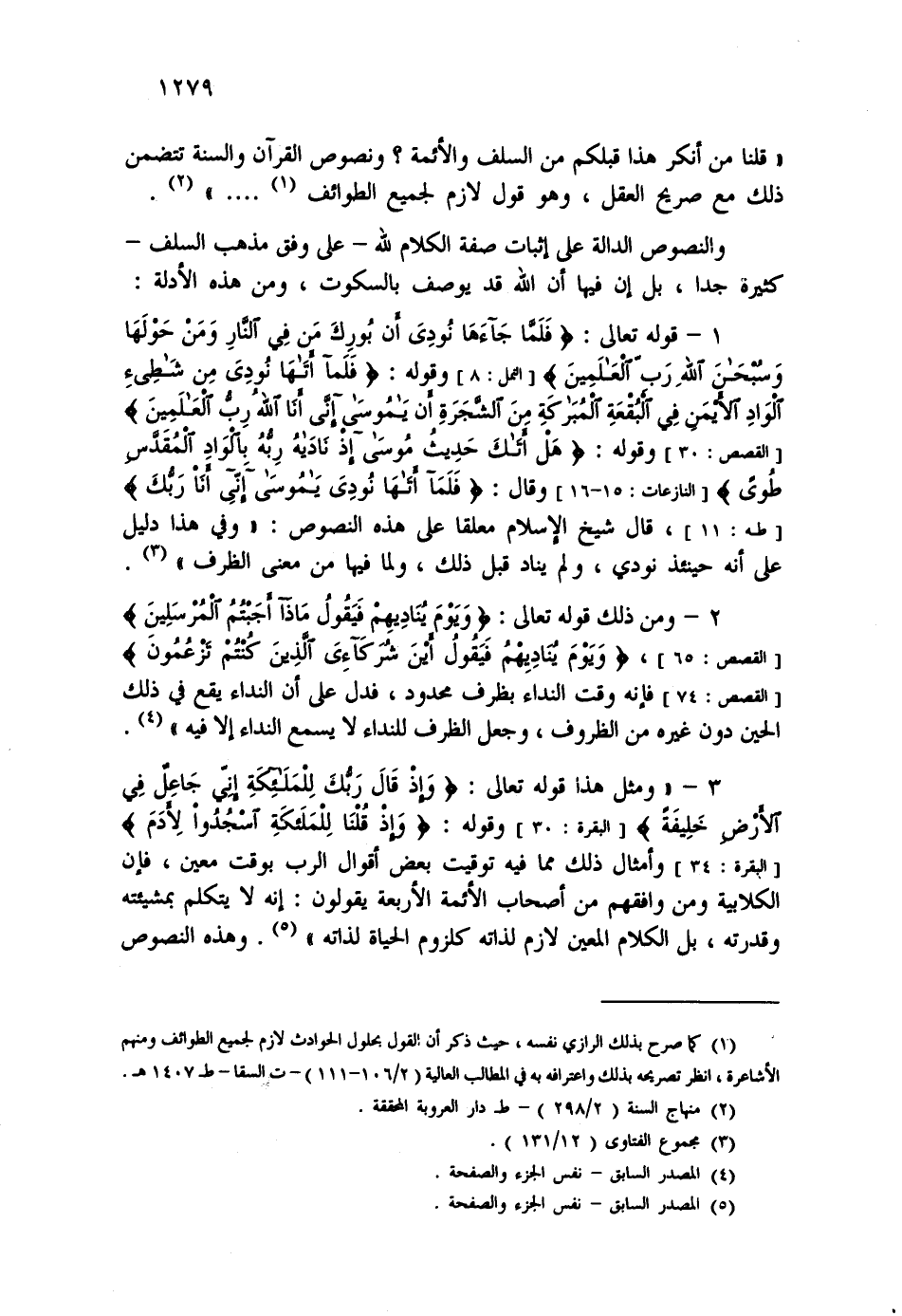 1- قوله تعالى: {فَلَمَّا جَاءَهَا نُودِيَ أَنْ بُورِكَ مَنْ فِي النَّارِ وَمَنْ حَوْلَهَا وَسُبْحَانَ اللَّهِ رَبِّ الْعَالَمِينَ} (النمل:8) وقوله: {فَلَمَّا أَتَاهَا نُودِيَ مِنْ شَاطِئِ الْوَادِ الْأَيْمَنِ فِي الْبُقْعَةِ الْمُبَارَكَةِ مِنَ الشَّجَرَةِ أَنْ يَا مُوسَى إِنِّي أَنَا اللَّهُ رَبُّ الْعَالَمِين} (القصص:30) وقوله: {هَلْ أَتَاكَ حَدِيثُ مُوسَى * إِذْ نَادَاهُ رَبُّهُ بِالْوَادِ الْمُقَدَّسِ طُوىً} (النازعات: من الآية 15-16) وقال: {فَلَمَّا أَتَاهَا نُودِيَ يَا مُوسَى} (طه:11) ، قال شيخ الإسلام معلقا على هذه النصوص: "وفي هذا دليل على أنه حينئذ نودي، ولم يناد قبل ذلك، ولما فيها من معنى الظرف" (¬3) .