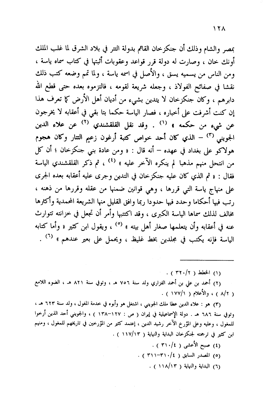 بمصر والشام وذلك أن جنكزخان القائم بدولة التتر في بلاد الشرق لما غلب الملك أونك خان، وصارت له دولة قرر قواعد وعقوبات أثبتها في كتاب سماه ياسة، ومن الناس من يسميه يسق، والأصل في اسمه ياسة، ولما تمم وضعه كتب ذلك نقشا في صفائح الفولاذ، وجعله شريعة لقومه، فالتزموه بعده حتى قطع الله دابرهم، وكان جنكزخان لا يتدين بشيء من أديان أهل الأرض كما تعرف هذا إن كنت أشرفت على أخباره، فصار الياسة حكما بتا بقى في أعقابه لا يخرجون عن شيء من حكمه" (¬1) . وقد نقل القلقشندى (¬2) عن علاء الدين الجويني (¬3) - الذى كان أحد خواص كتبة أرغون زعيم التتار وكان هجوم هولاكو على بغداد في عهدهـ أنه قال: " ومن عادة بني جنكزخان؛ أن كل من انتحل منهم مذهبا لم ينكره الآخر عليه " (¬4) ، ثم ذكر القلقشندي الياسة فقال: " ثم الذي كان عليه جنكزخان في التدين وجرى عليه أعقابه بعده الجرى على منهاج ياسة التي قررها، وهي قوانين ضمنها من عقله وقررها من ذهنه، رتب فيها أحكاما وحدد فيها حدودا ربما وافق القليل منها الشريعة المحمدية وأكثرها مخالف لذلك سماها الياسة الكبرى، وقد اكتتبها وأمر أن تجعل في خزانته تتوارث عنه في أعقابه وأن يتعلمها صغار أهل بيته " (¬5) ،