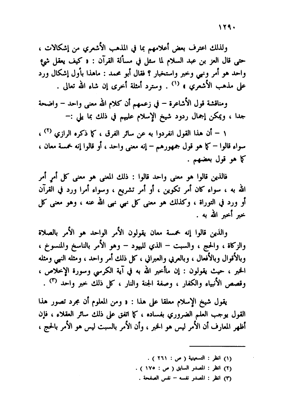 ولذلك اعترف بعض أعلامهم بما في المذهب الأشعري من إشكالات، حتى قال العز بن عبد السلام لما سئل في مسألة القرآن: "كيف يعقل شيء واحد هو أمر ونهي وخبر واستخبار؟ فقال أبو محمد: ما هذا بأول إشكال ورد على مذهب الأشعري" (¬1) . وسترد أمثلة أخرى إن شاء الله تعالى.