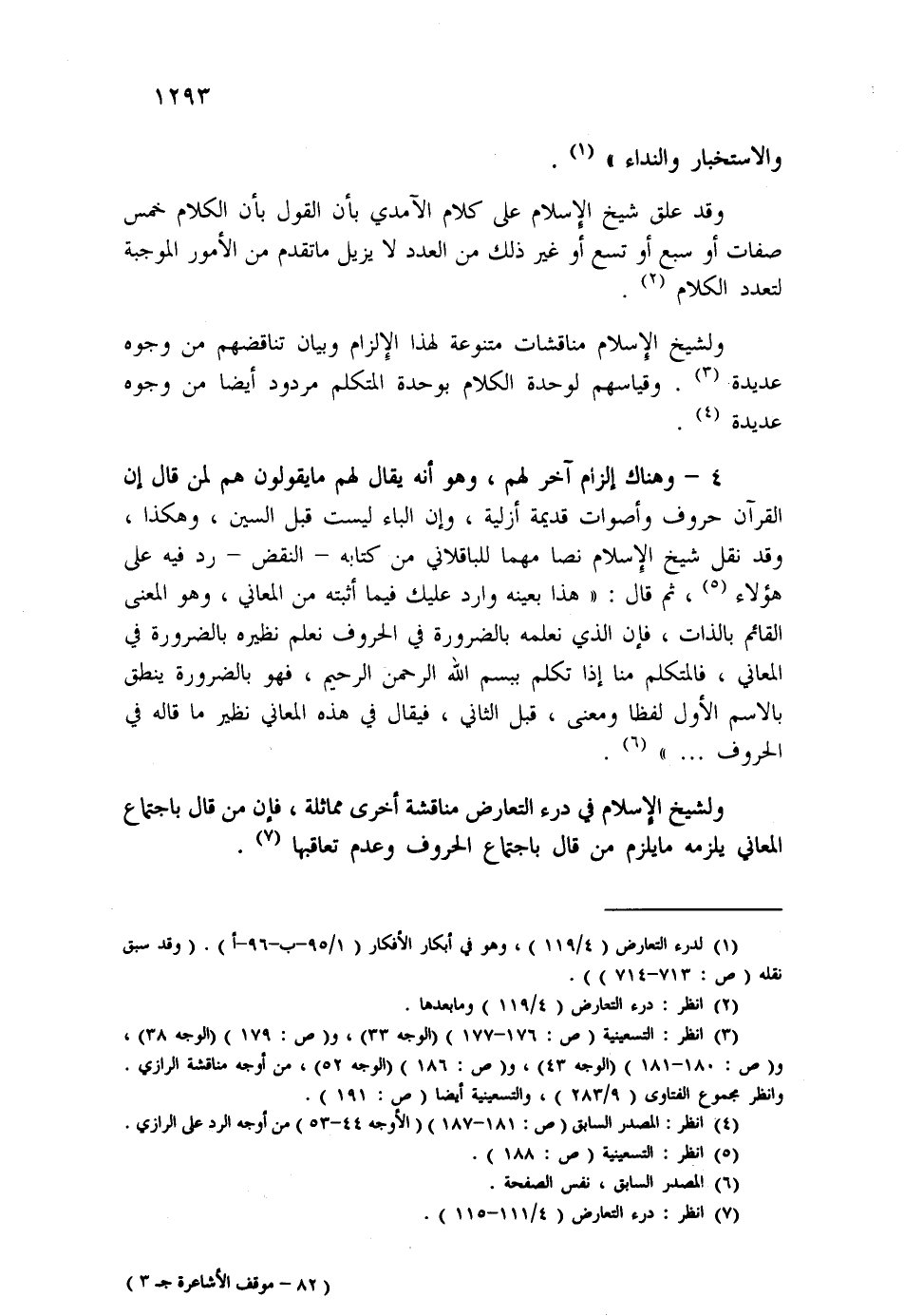 (¬3) انظر: التسعينية (ص:176-177) (الوجه 33) ، (ص:179) (الوجه 38) ، و (ص:180-181) (الوجه 43) ، و (ص:186) (الوجه 52) ، من أوجه مناقشة الرازي وانظر مجموع الفتاوى (9/283) ، والتسعينية أيضا (ص:191) .