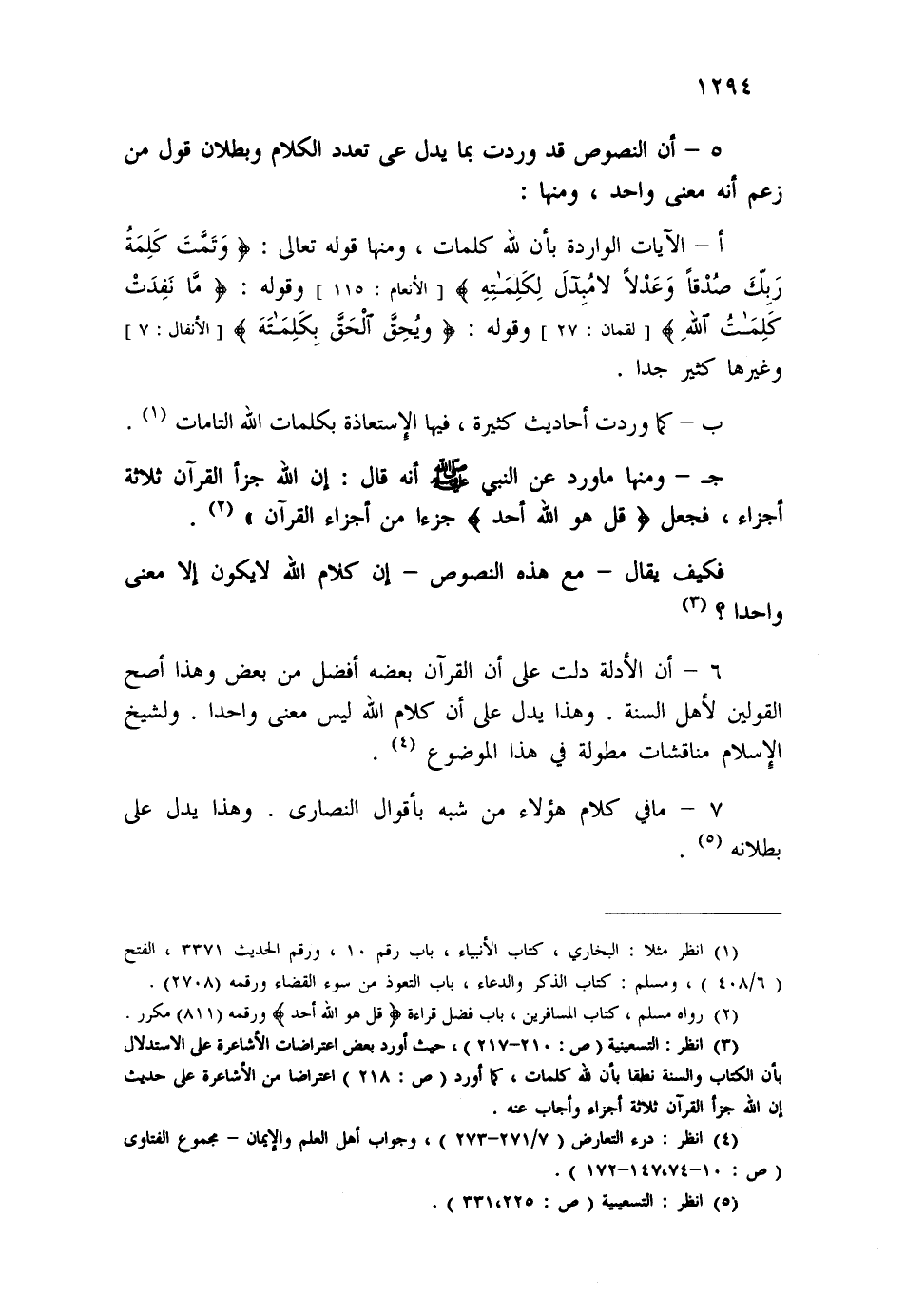 (¬3) انظر: التسعينية (ص:210-217) ، حيث أورد بعض الأشاعرة على الاستدلال بأن الكتاب والسنة نطقا بأن لله كلمات، كما أورد (ص:218) اعتراضا من الأشاعرة على حديث إن الله جزأ القرآن ثلاثة أجزاء وأجاب عنه.