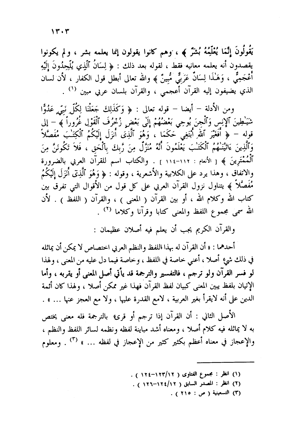 أحدهما: "أن القرآن له بهذا اللفظ والنظم العربي اختصاص لا يمكن أن يماثله في ذلك شيء أصلا، أعني خاصة في اللفظ، وخاصة فيما دل عليه من المعنى، ولهذا لو فسر القرآن ولو ترجم، فالتفسير والترجمة قد يأتي أصل المعنى أن يقربه، وأما الإتيان بلفظ يبين المعنى كبيان لفظ القرآن فهذا غير ممكن أصلا، ولهذا كان أئمة الدين على أنه لا يقرأ بغير العربية، لا مع القدرة عليها، ولا مع العجز عنها ... ".