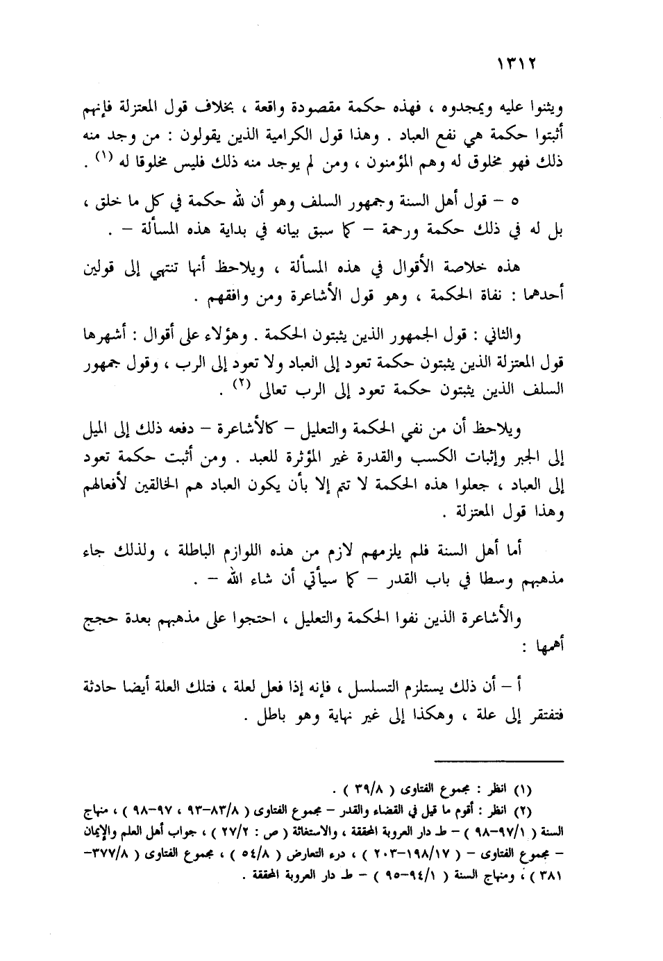 (¬2) انظر: أقوم ما قيل في القضاء والقدر - مجموع الفتاوى (8/83-93، 97-98) ، منهاج السنة (1/97-98) ط دار العروبة المحققة، والاستغاثة (ص:2/27) ، جواب أهل العلم والإيمان - مجموع الفتاوى - (17/198-203) ، درء التعارض (8/54) ، مجموع الفتاوى (8/377-381) ، ومنهاج السنة (1/94-95) ط دار العروبة المحققة.